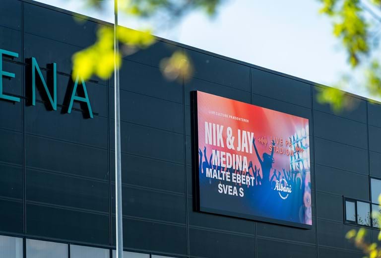 Den anden LED-storskærm måler 9x5 meter og er placeret på Jyske Bank Arena og vender ud mod parkeringsarealerne og den trafikerede Ørbækvej. Denne placering sikrer, at både forbipasserende og besøgende nemt kan se annonceringer og reklamer, hvilket giver en bred eksponering og øger synligheden for de mange arrangementer, der finder sted i arenaen.