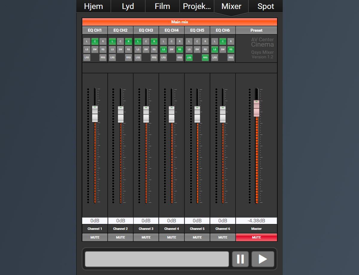 Q-sys systemet er netværksbaseret og kontrollerer alle enhederne fra en central processor, hvortil der tilsluttes de enkelte komponenter og udstyr. Vi kan integrere betjeningen af projekter, server, lysdæmpere til salslyset, lydmikser til mikrofonerne, projektører til brug på scenen, BluRay DVD afspiller, samt udstyr for tilslutning og distribution af HDMI-signaler.