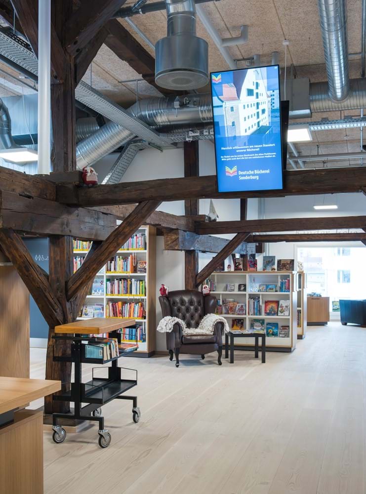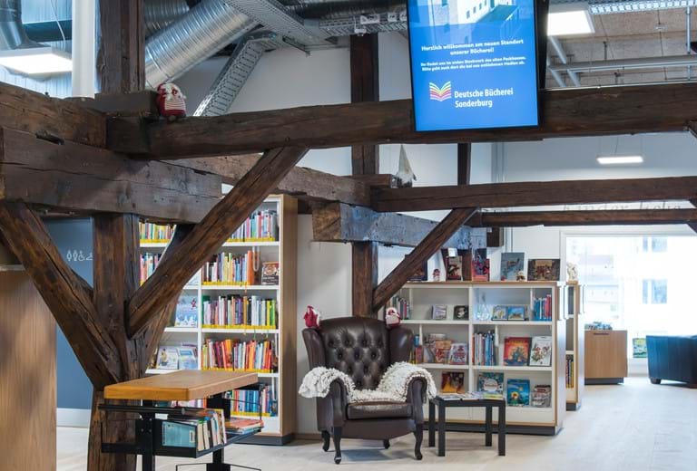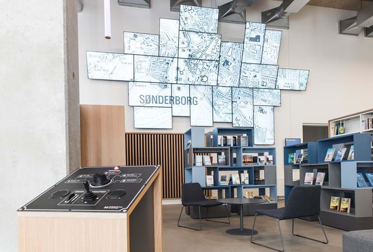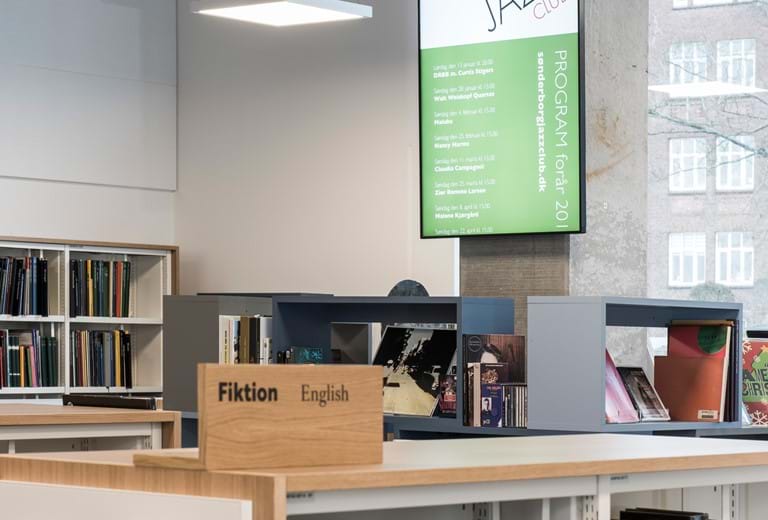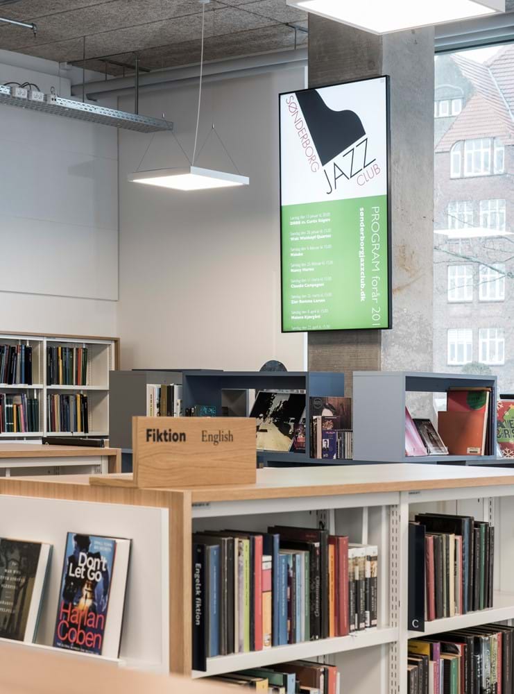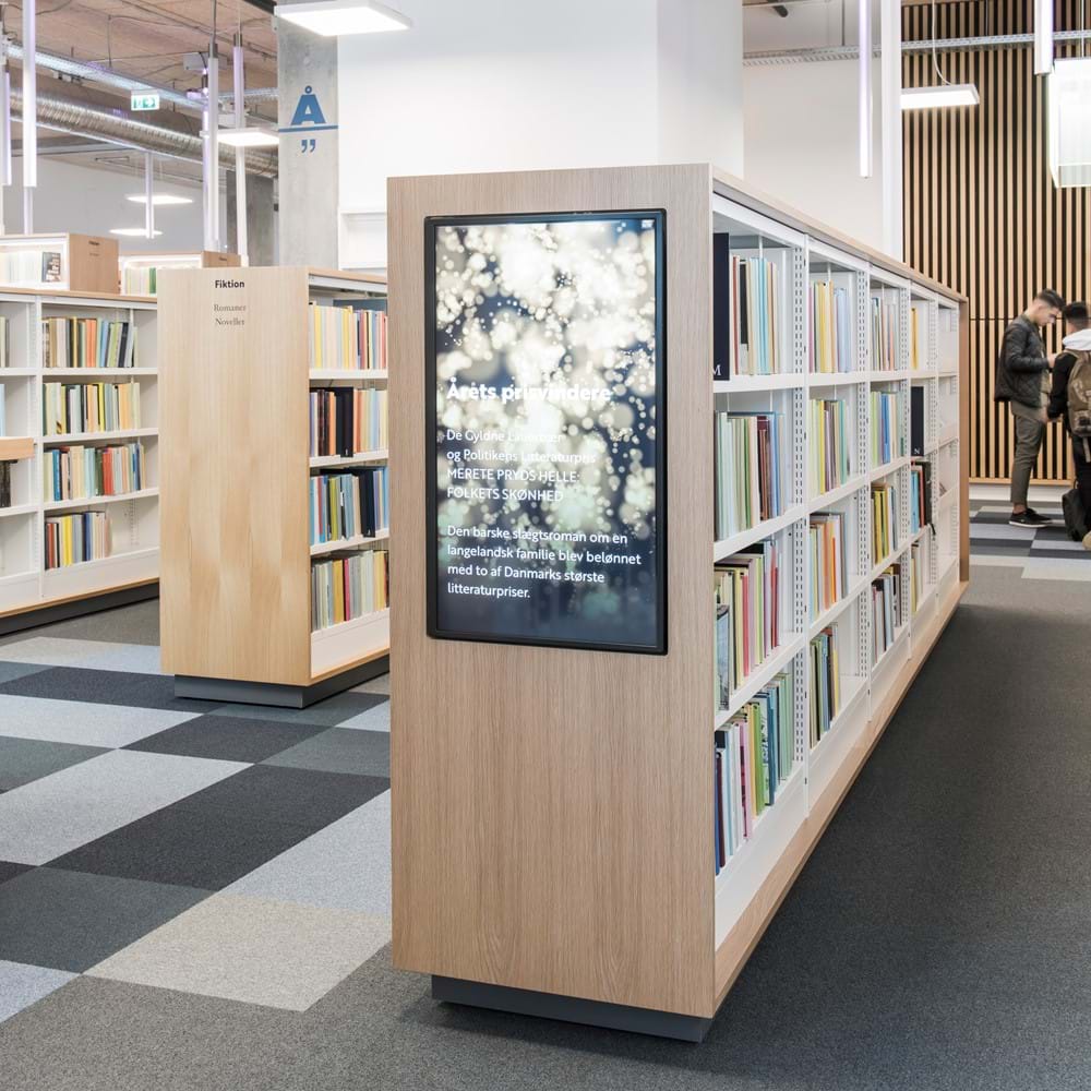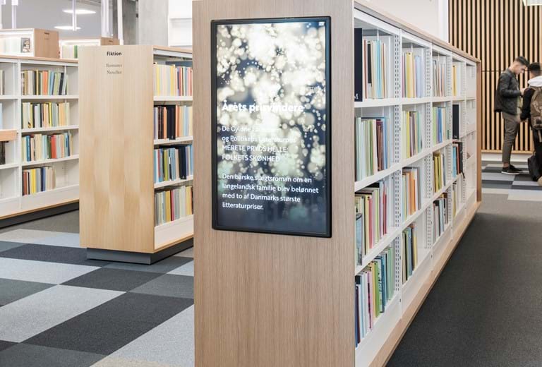 Infoskærmene har vide muligheder for implementering. Med koordinering er det let at indbygge skærmene i eksempelvis bogreoler eller på anden måde installere dem, så de fremstår som en naturlig del af biblioteket. Det er altid en god ide at tænke AV-løsningen ind i forbindelse med ombygning, nybyggeri og lignende, men uanset hvornår vi inddrages, sørger vi for at finde en god løsning.