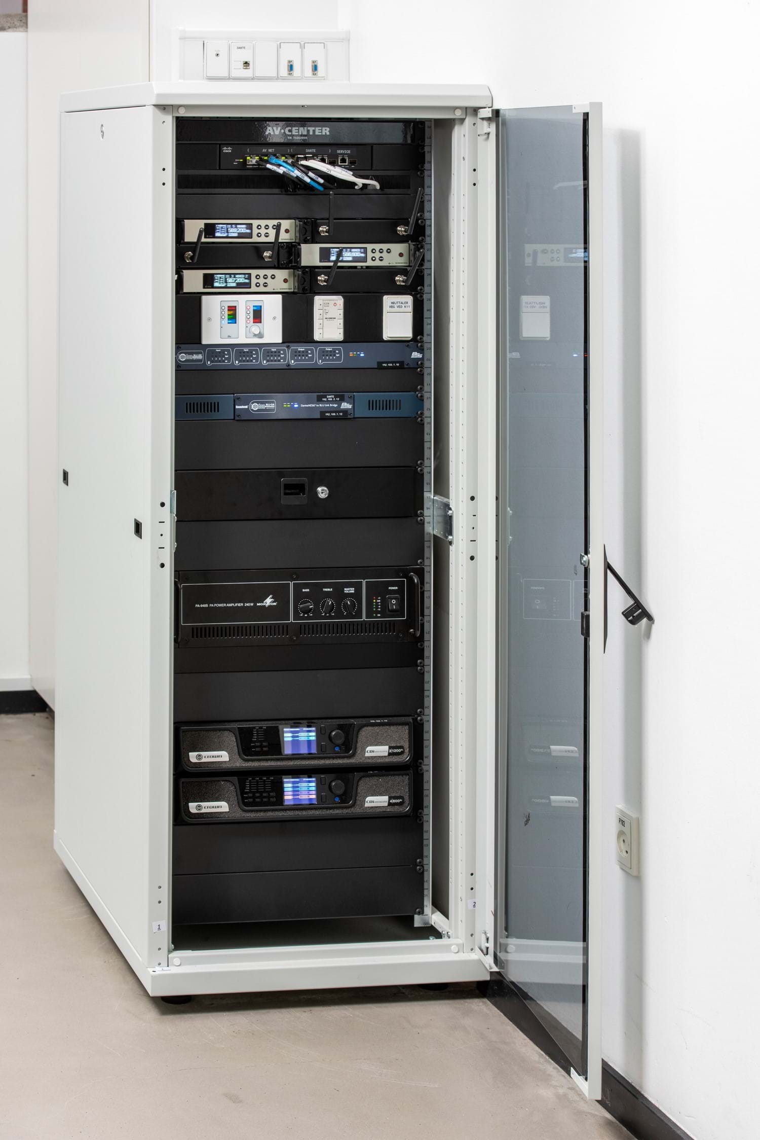 Uanset hvor nem vi gør betjeningen, så kommer vi ikke udenom, at en aula typisk vil bestå af en del forskelligt AV-udstyr, som skal forbindes. Det samler vi som oftest i et teknikskab (rack), som er hjertet i AV-løsningen.