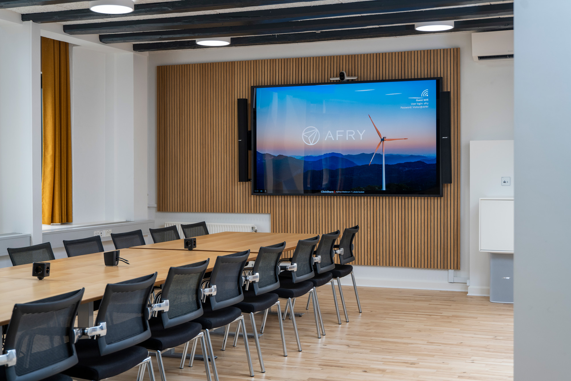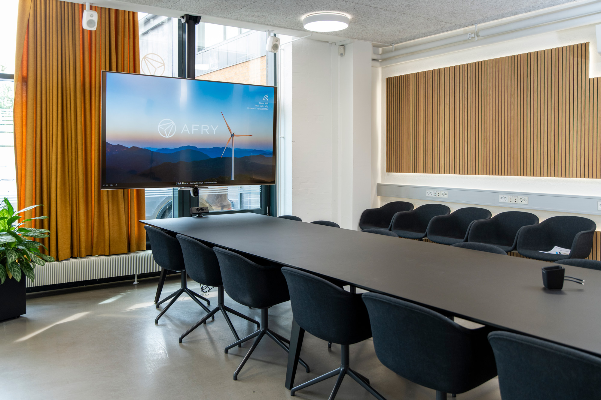Mødelokalerne hos AFRY er bestykket med skærme i forskellige størrelser – blandt andet en 100” Sony skærm i det største mødelokale. Det er muligt at dele sit indhold fra ens enhed via Barco Clickshare. Når mødelokalet ikke er booket til et møde, viser skærmene brandingvideoer fra AFRY og information om næste bookede møde. Efter et nærmere bestemt tidsinterval går skærmene i dvale for at spare strøm.