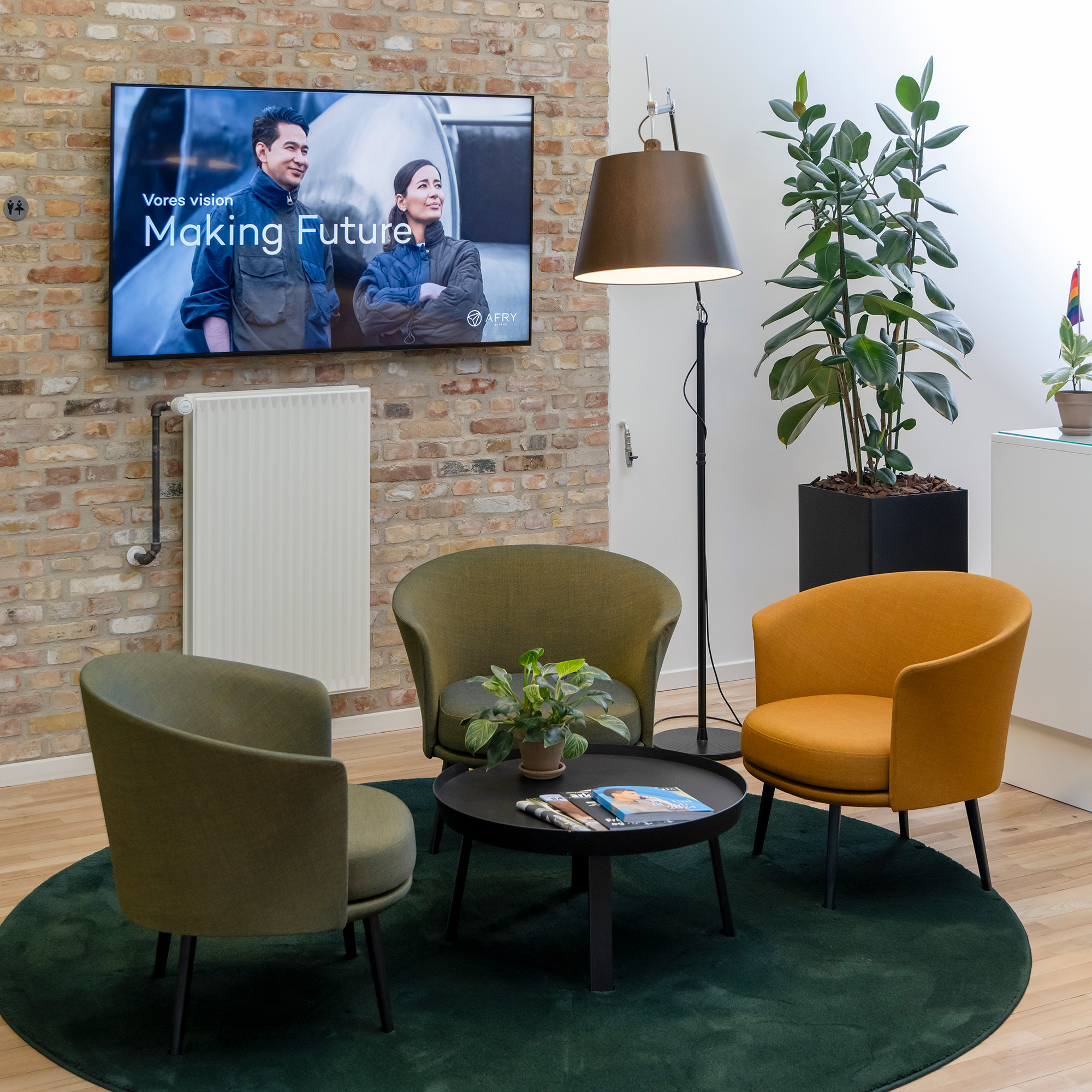 I indgangs- og velkomstområdet hos AFRY i Aarhus er der installeret en infoskærm, der viser brandingvideoer og billeder.