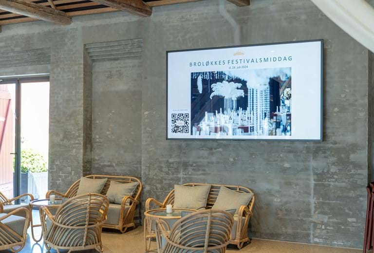 Ligeledes er der installeret en SONY 100” 4K skærm, der blandt andet bruges til at vise information om Broløkke og kommende arrangementer.