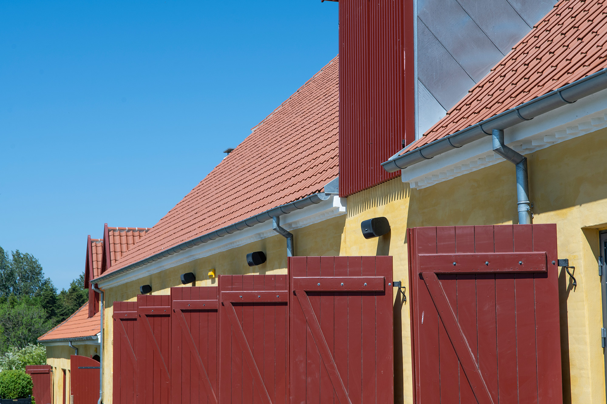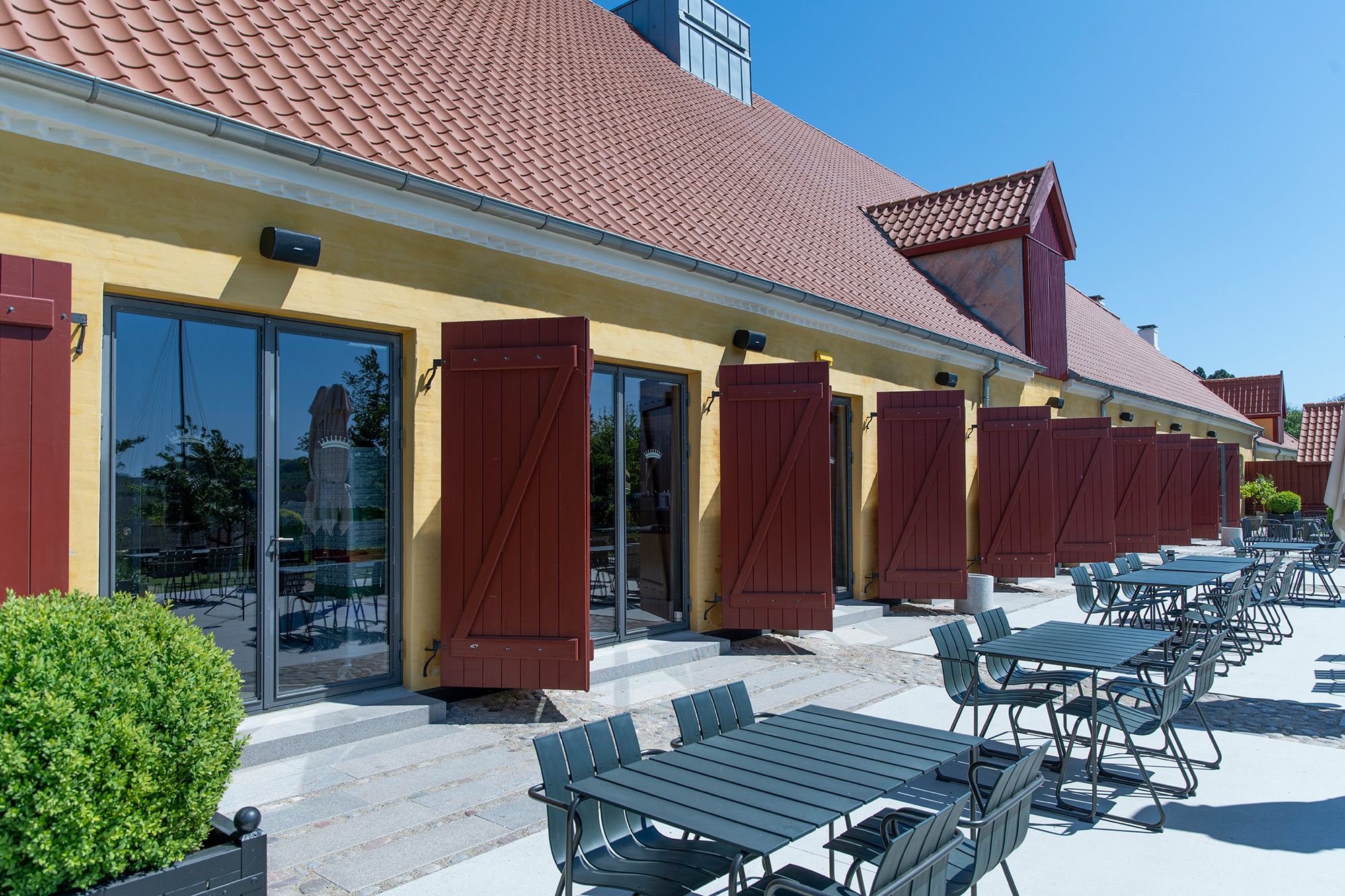 På terrassen ved siden af Kostalden, hvor gæster kan nyde udendørs arrangementer eller en øl fra Broløkkes eget bryggeri, har vi installeret en BOSE udendørs højttalerløsning. Disse højttalere er designet til at levere fremragende lyd i alle vejrforhold, hvilket gør dem perfekte til udendørs brug.