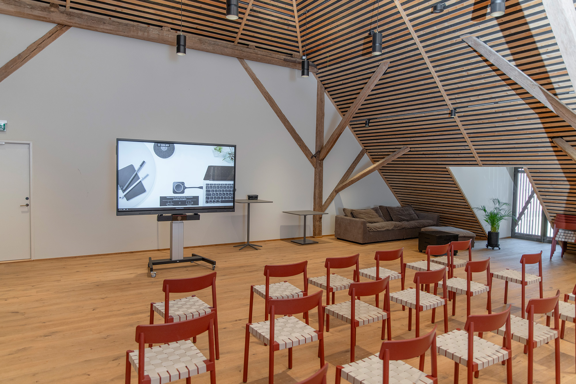 I hver ende af Kostalden er der reposer, der kan bruges som break-out områder ved konferencer eller til mindre møder. Til disse områder har vi leveret en 86” touchskærm fra Clevertouch, der er monteret på en mobilstander, så den kan flyttes rundt efter behov.