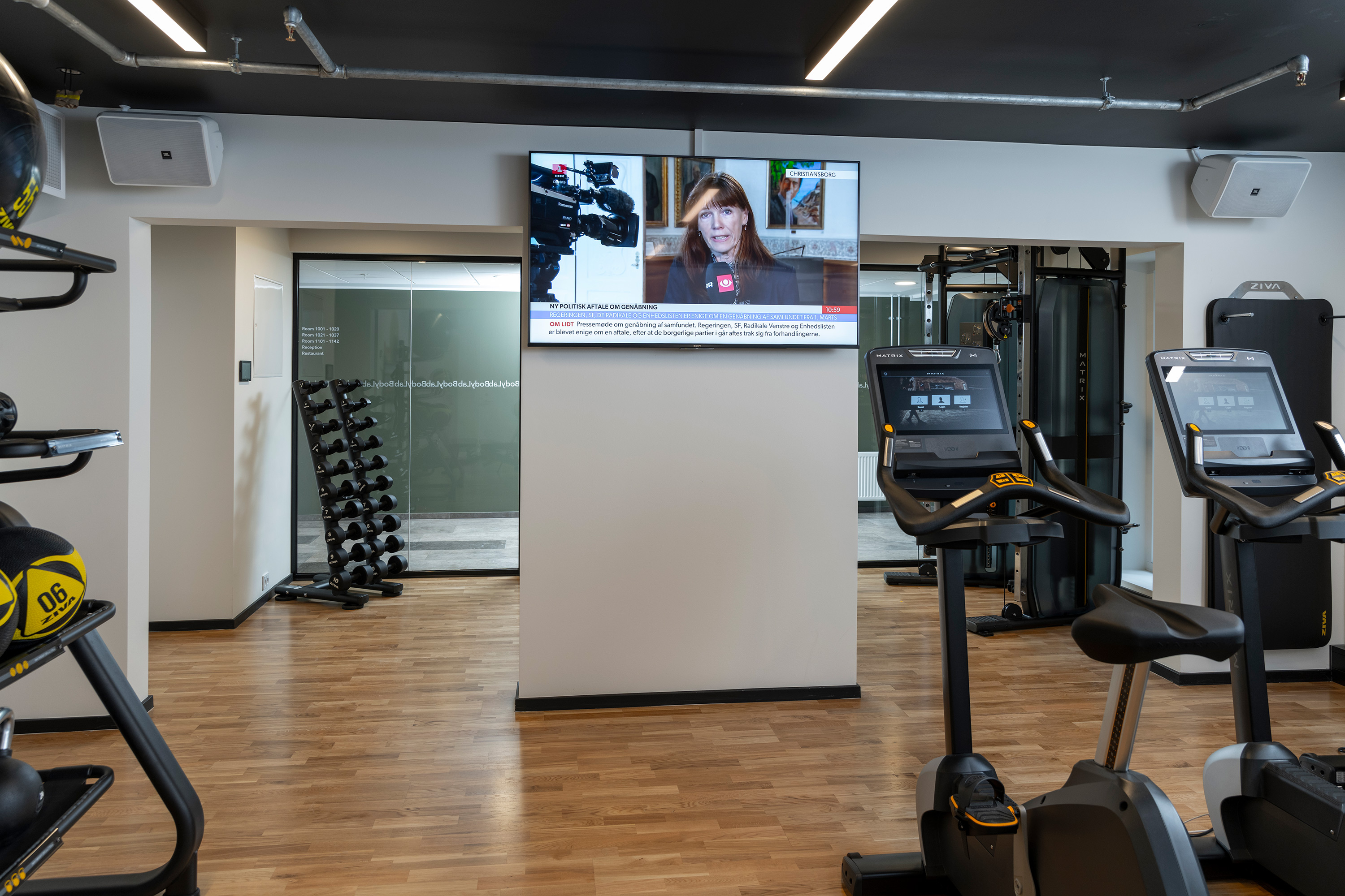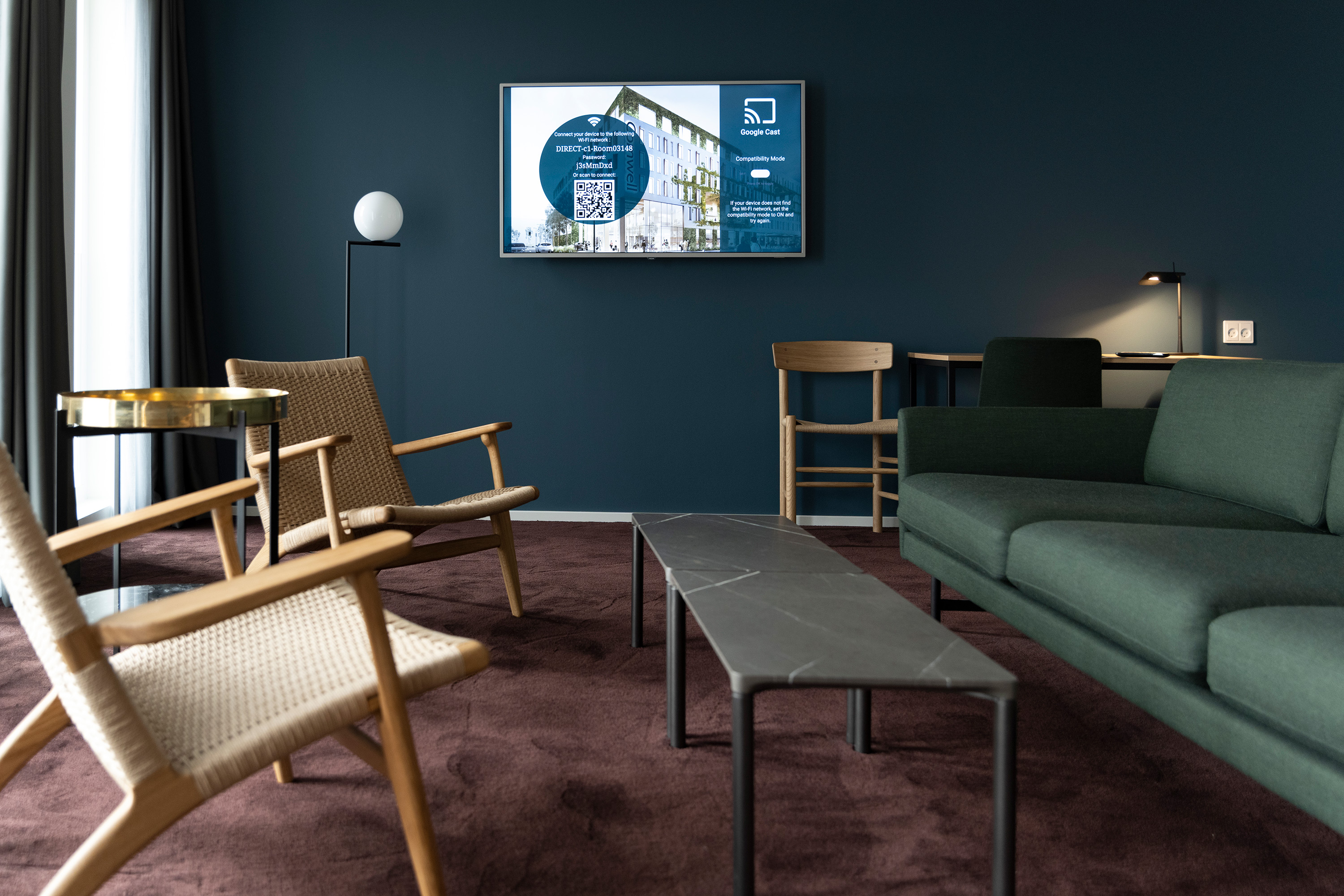I de store møderum er der valgt Samsung 98” LCD skærm, mens der bruges 55” LCD skærme i de otte lidt mindre huddle rooms. I alle rum er der Barco Clickshare, så alle brugere trådløst kan tilgå skærme og lyd. De selvsamme 98” skærme bliver også anvendt som infoskærme rundt omkring på hotellet, og hotellets personale kan lægge specialiseret og individuel information op på både konferenceskærme og på infoskærme med tilbud, velkomst og lignende. Til denne tilgang bliver der brugt Crestron NVX digitaldistribution. Crestron touchskærme er betjeningspanel i konferencerum, lobby og barer. Møderums kunderne behøver ikke at tænke på teknik, når de tager rummet i anvendelse. PIR sensorer sørger automatisk for at tænde alt AV-udstyr, når kunden går ind i rummet.