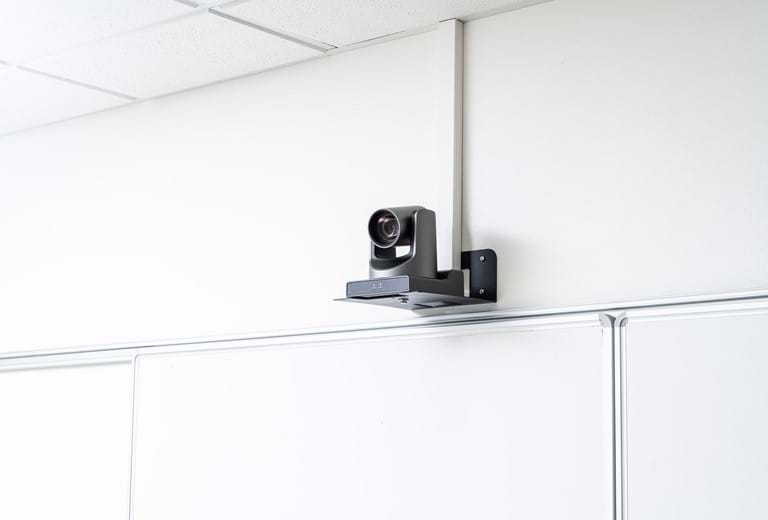 Da man hos Dansk Fjernvarme havde et ønske om også at kunne bruge auditoriet til online videomøder har vi installeret et Full HD-kamera og to Sennheiser loftsmikrofoner. En sjov detalje er, at loftmikrofonen forrest i auditoriet er monteret nedenunder projektorliften, der kører ned fra loftet, når auditoriet bruges. Den anden loftsmikrofon er monteret i loftet bagerst i auditoriet.