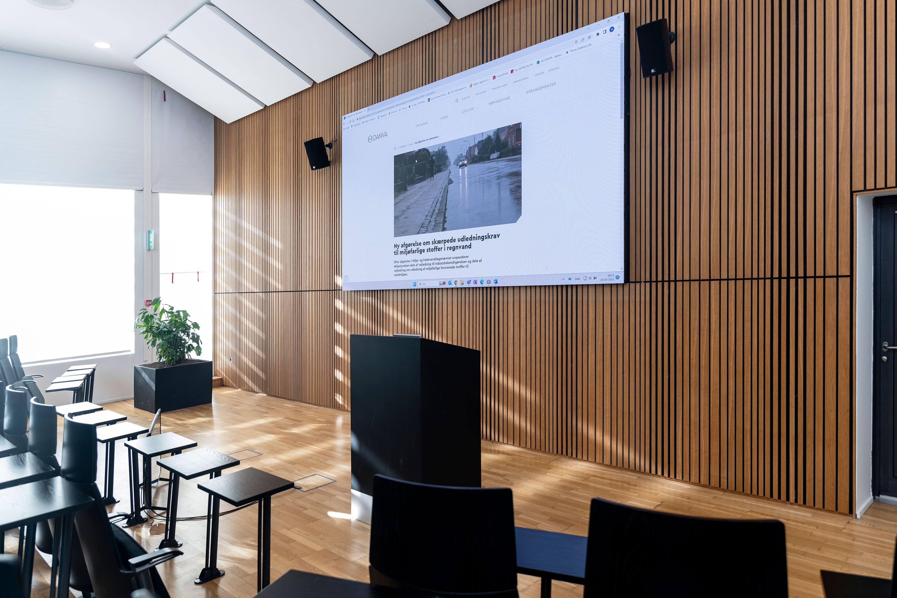 DANVA havde et ønske om at opgradere billede-løsningen i auditoriet og vi har derfor installeret en 176” og 3,6 meter bred Samsung LED-storskærmsløsning. Lysindfaldet er stadig meget kraftigt, men nu behøver man faktisk ikke mørklægge auditoriet for at se, hvad der er på skærmen.