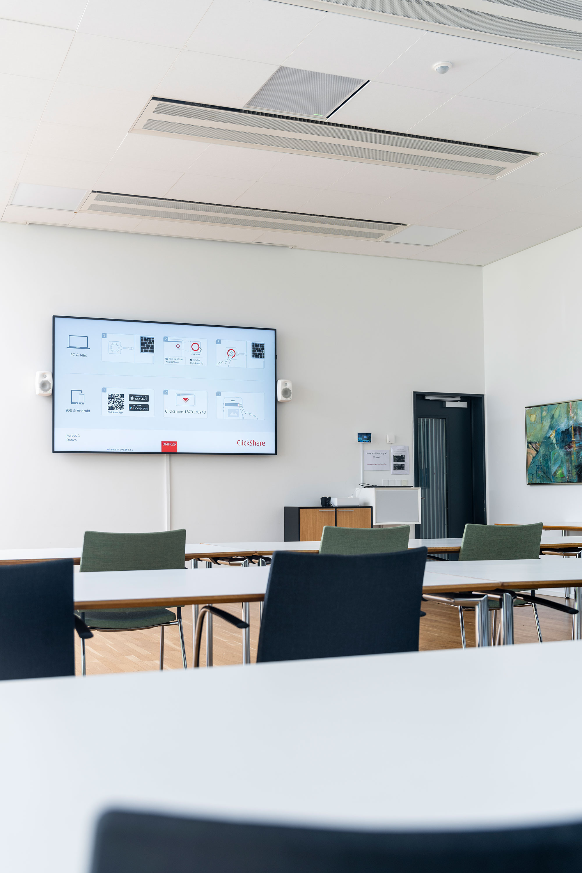 Som alle andre virksomheder afholdes flere og flere møder online. For at imødekomme dette er der i bestyrelseslokalet installeret en Poly G85T Microsoft Teams Rooms løsning med touch-betjeningspanel, 84” Philips skærm, 2 stk. Shure MXA710 loftsmikrofoner og 3 hvide Shure indbygningshøjttalere med netværksopkobling. For trådløs deling af indhold til lokalets skærm er der installeret en Barco ClickShare løsning.