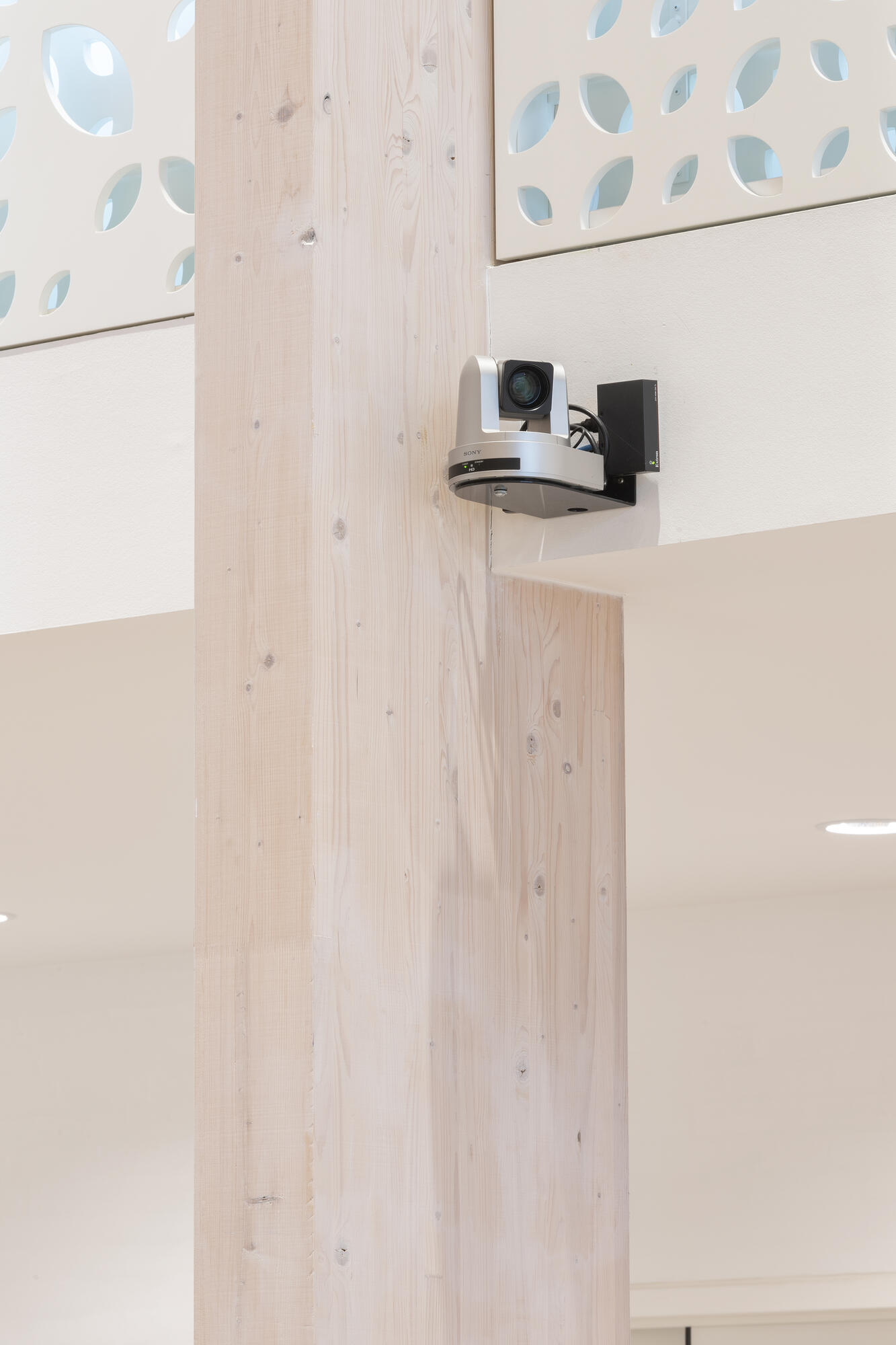 Der er også installeret et kamera og en mikrofon, der opfanger billede og lyd fra kirkerummet. I det tilstødende sognelokale og konfirmandlokale, er der installeret en projektor/lærred løsning og BOSE højttalere, så man kan følge med i det, der sker i kirken.