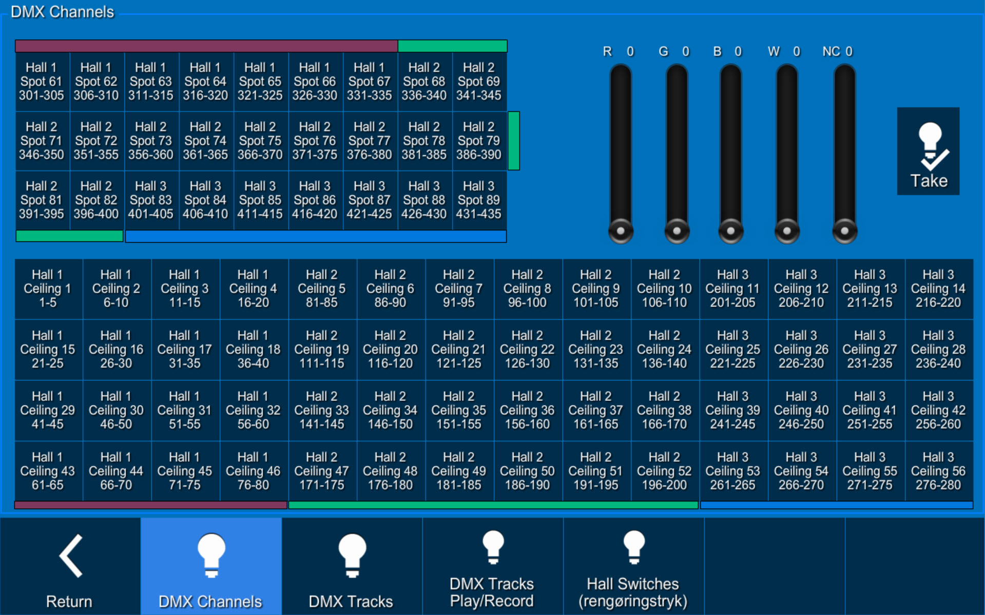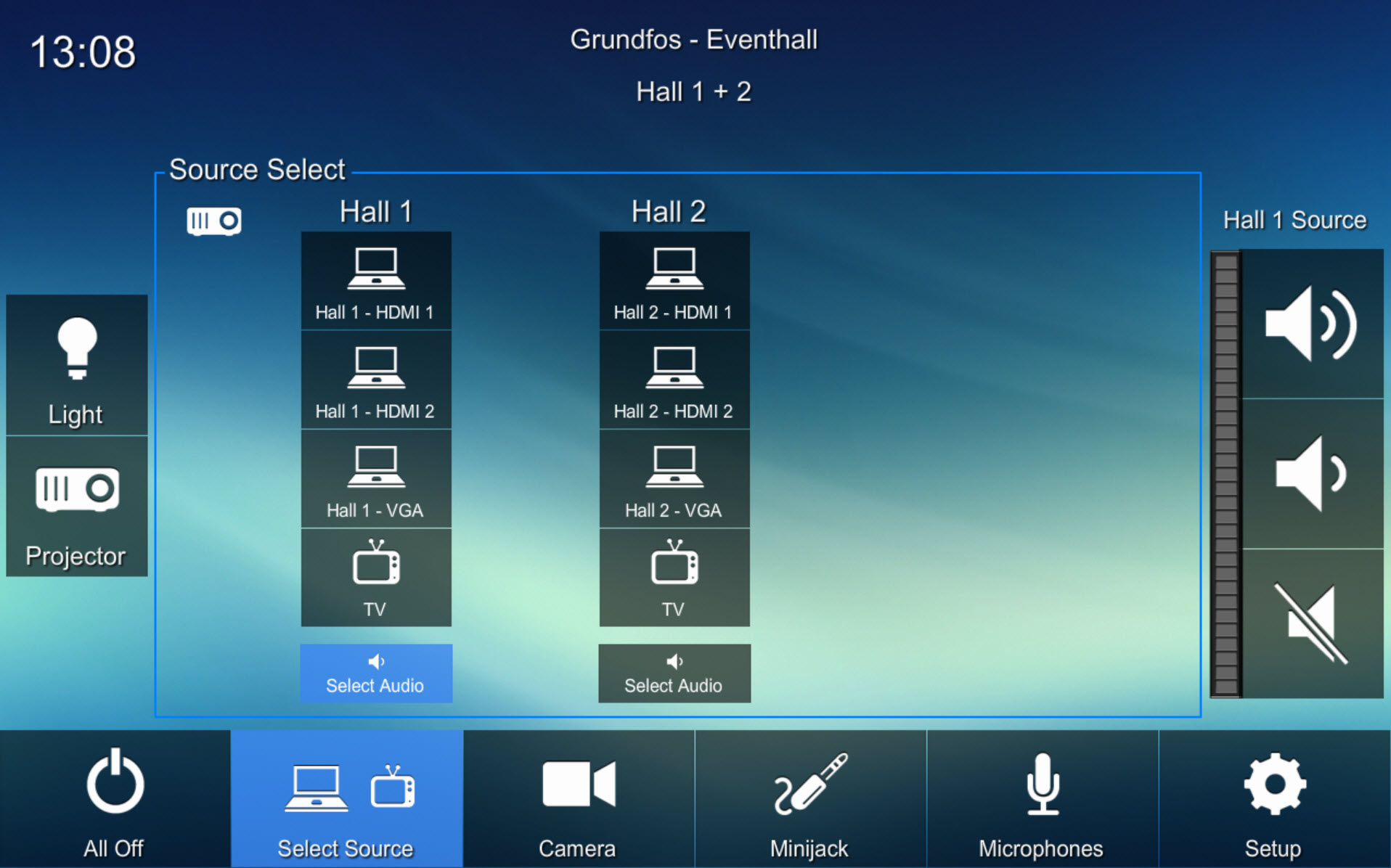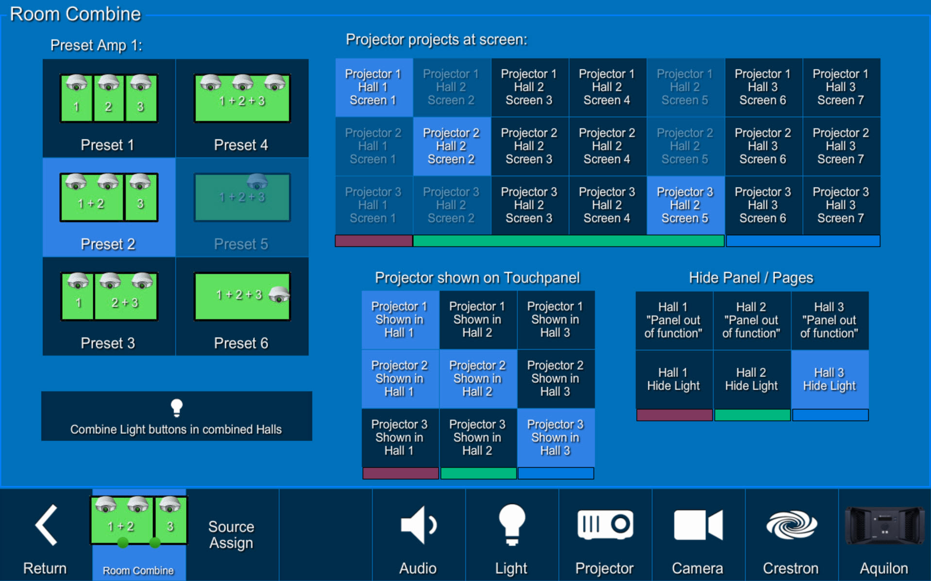 Den generelle styring af hele salen og alle de vidt forskellige AV-scenarier bliver udført af en Crestron Crontroller og her har AV CENTER lavet en gennemarbejdet programmering med preset både for teknisk AV-personale og for alm. brugere, så salens dagligdags-funktioner kan styres fra et enkelt og intuitivt layout.