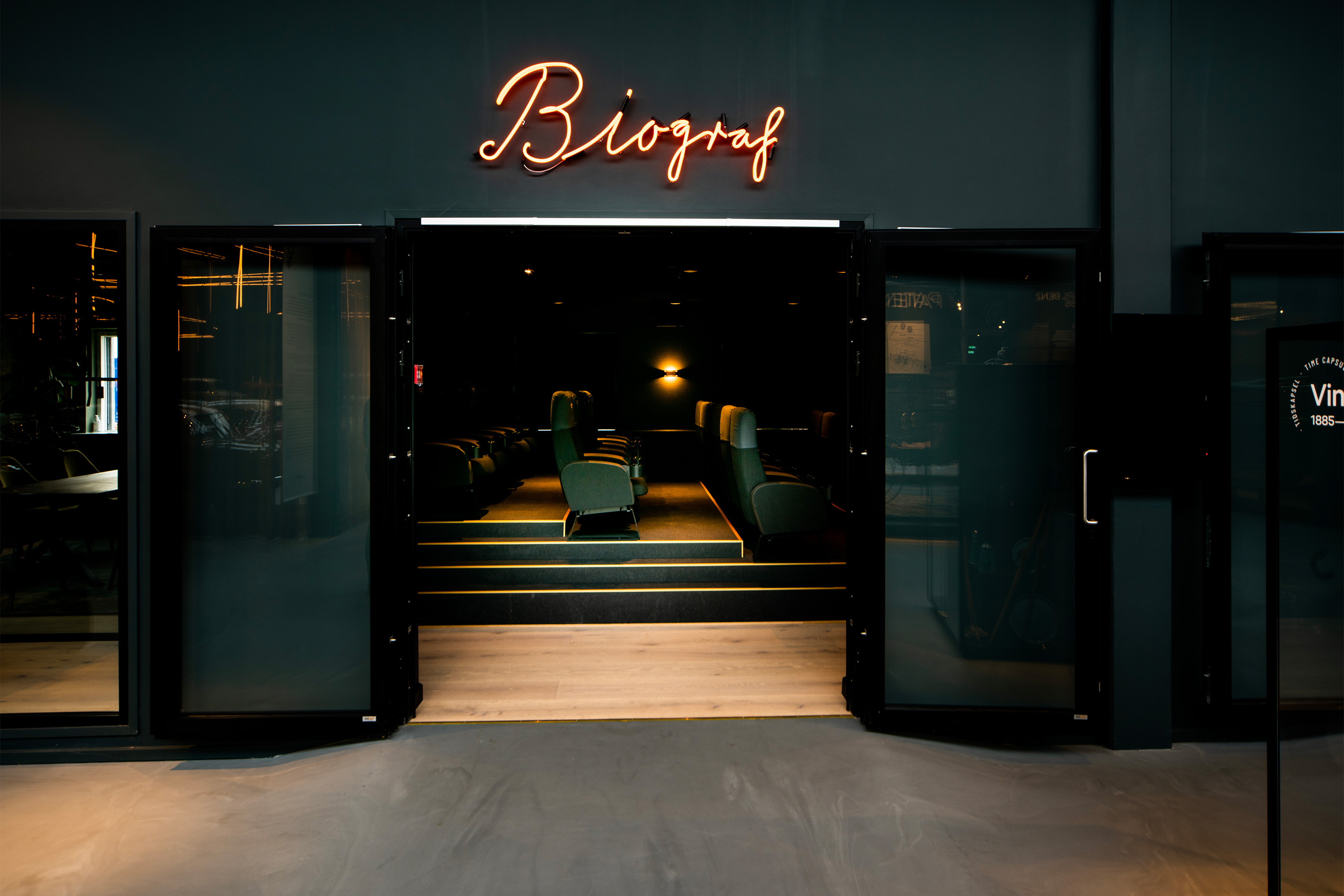 Fra biludstillingen er der adgang til en lille biograf, hvor der løbende vises forskellige film, der på den ene eller anden måde handler om biler. Vi har til biografen installeret en 98” skærm med tilhørende professionelt Dolby Surround Sound højttaleranlæg.