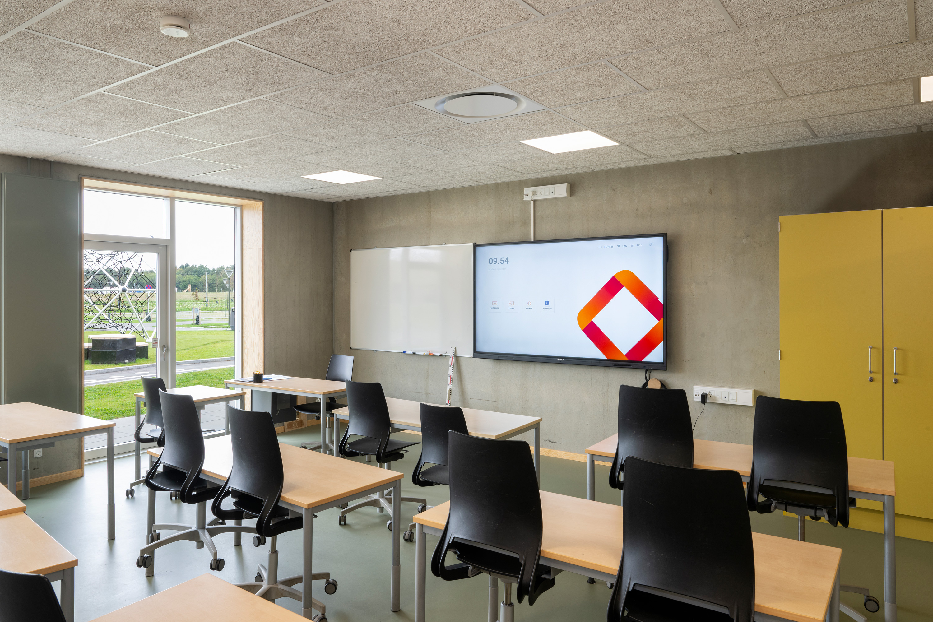 Alle undervisnings- og faglokaler er udstyret med 86” touchskærme fra I3. Touchskærmene i indskolingen er monteret på højdejusterbart beslag, så de nemt, enkelt og med fingeren kan justeres til rette arbejdshøjde. Dette er en stor fordel at touchskærmen kan køres helt ned, når børnene bruger den og op igen, når læreren skal tegne og fortælle. En del af touchskærmene er monteret på mobil stander, så de kan flyttes rundt efter behov – også disse har naturligvis mulighed for nemt og enkelt at justere arbejdshøjden.