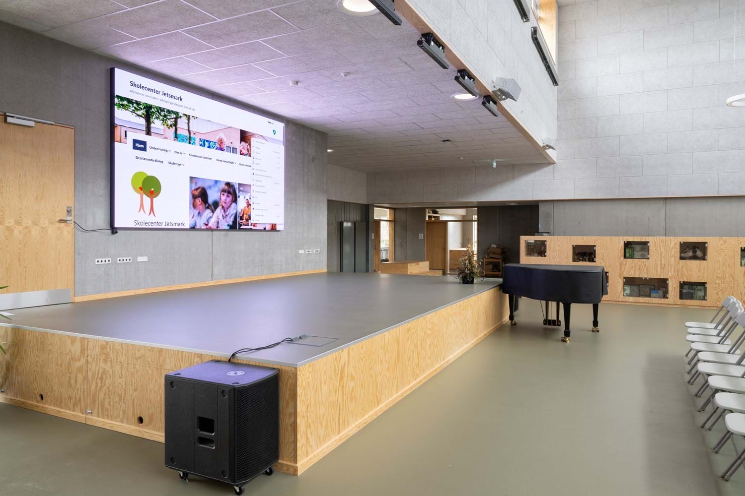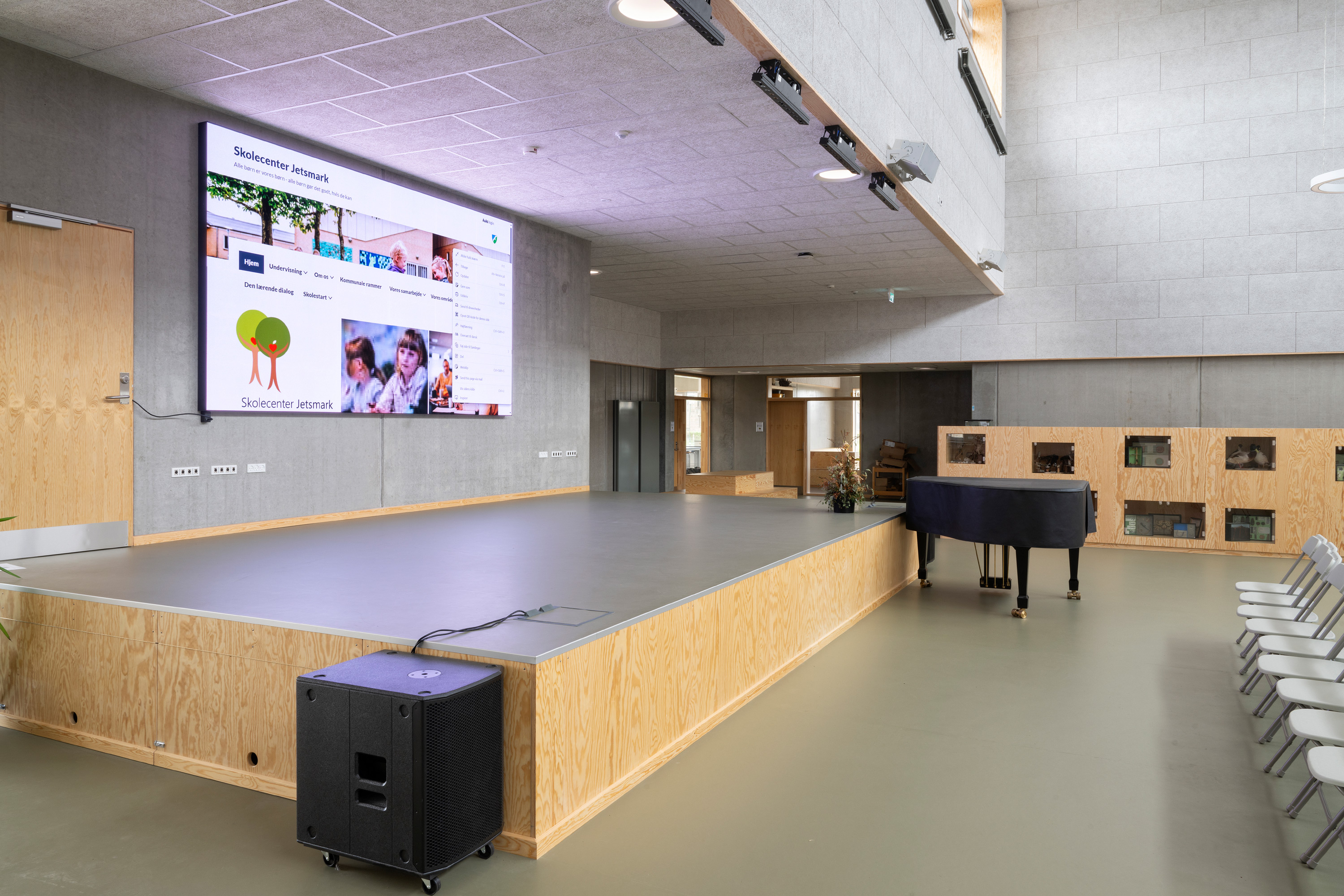 Vi har på skoletorvet installeret en 163” stor LED-storskærm. Skærmens størrelse og lysstyrke gør, at alle i lokalet kan se, hvad der bliver vist uanset om det er sangtekster til morgensamling eller dagsordenen ved en generalforsamling om aftenen. Der er ligeledes installeret lydanlæg og Sennheiser trådløst mikrofonsystem. Da scenen på fællestorvet også bruges til foredrag og teater er der også installeret frontlys, så personerne på scenen kan belyses.
