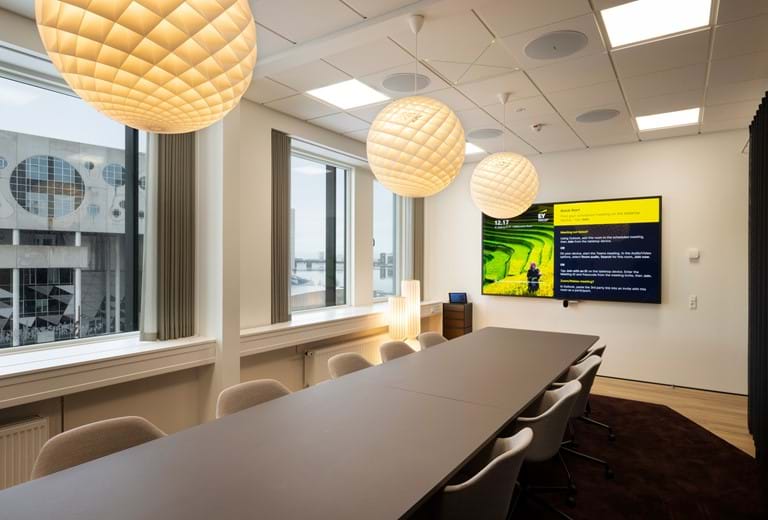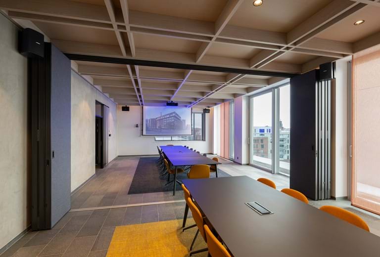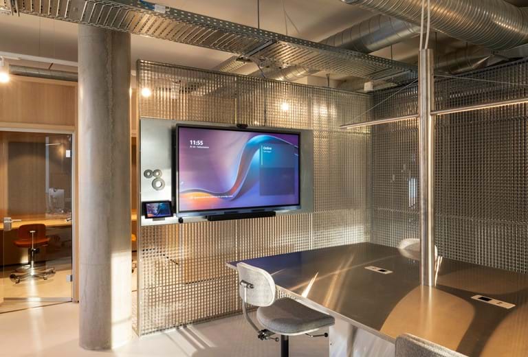 Dagens mødelokaler er ikke kun optimeret til fysiske møder. Behovet for online videomødelokaler er stadig stigende og derfor er størstedelen af mødelokalerne i kontorhuset også indrettet og bestykket, så de kan bruges til afholdelse af videomøder.