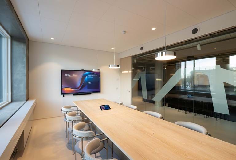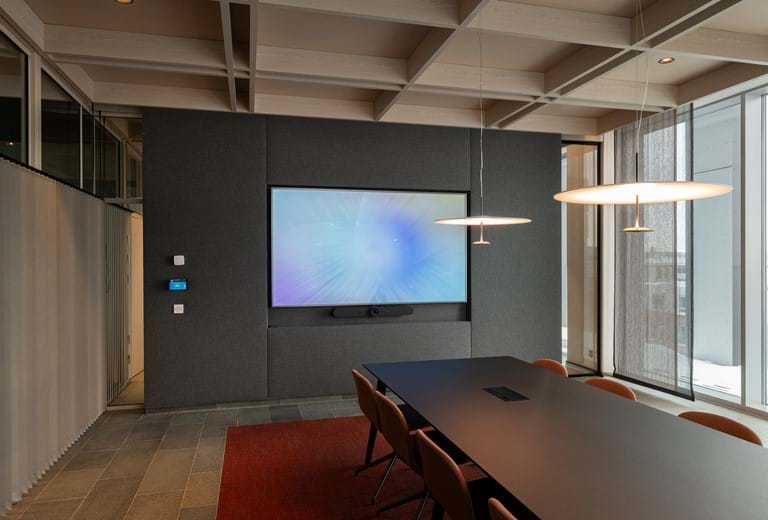 Der er naturligvis også store mødelokaler der er bestykket som Microsoft Teams Rooms, hvor videomøderne afvikles fra lokalets udstyr. For at sikre god mikrofonlyd, er der i udvalgte lokaler også installeret loftsmikrofoner fra Sennheiser og loftshøjttalere fra BOSE Professional.