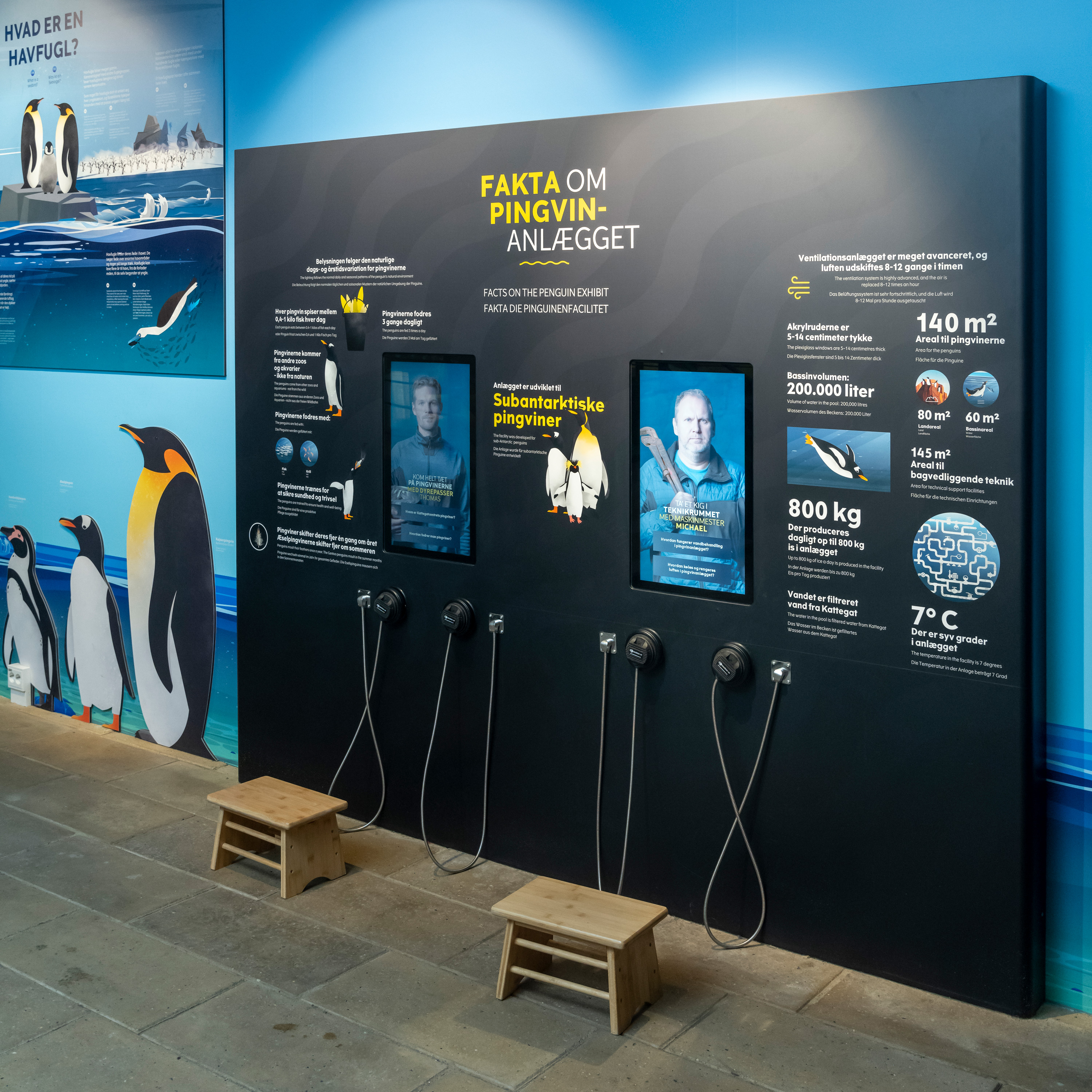 Forskellige steder er der lytteposter, hvor gæsterne kan tage høretelefoner på og få info om pingvinerne.