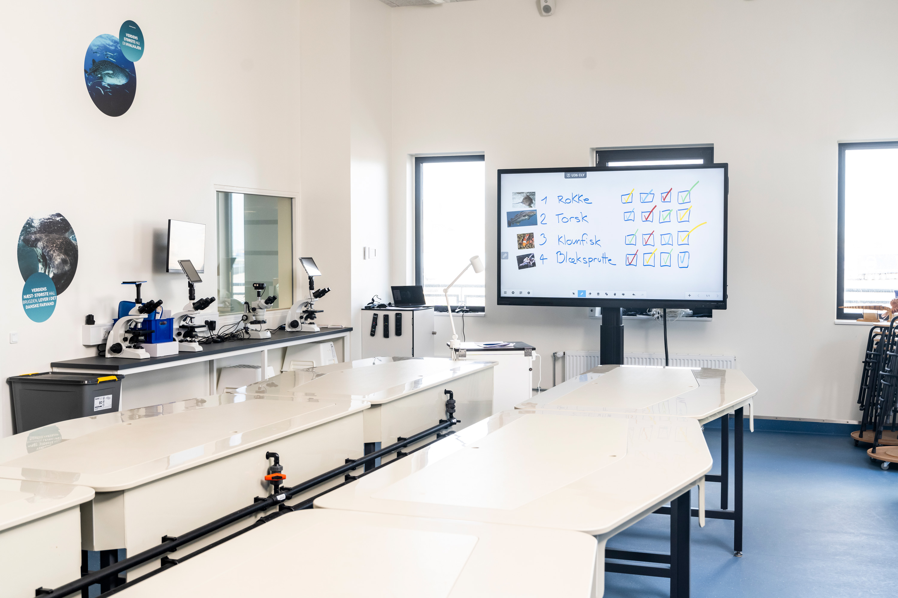 Kattegatcenteret har udover akvarier og udstillingsområder også en aktiv skoletjeneste, som hvert år besøges af over 12.000 elever og studerende. Vi har til skoletjenesten leveret en Clevertouch touchskærm, som er monteret på en højdejusterbar mobil stander, så den kan flyttes rundt i lokalet.