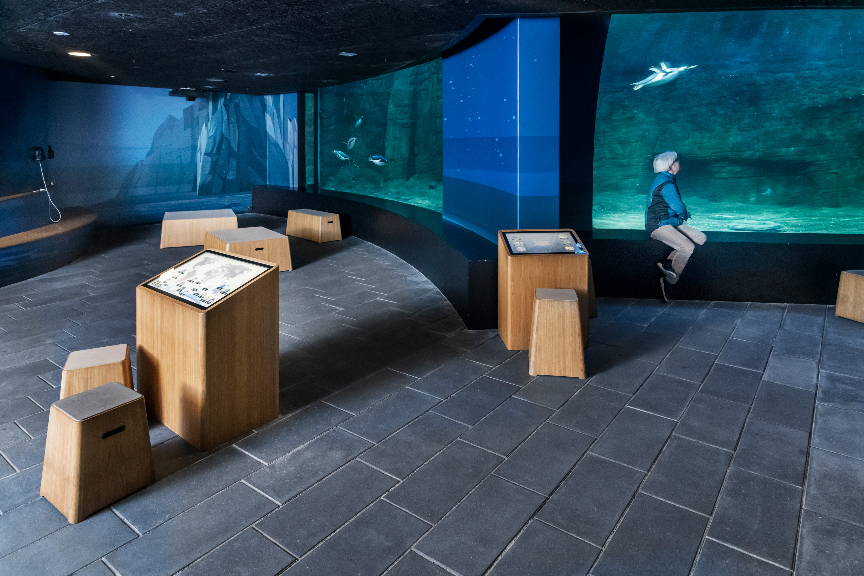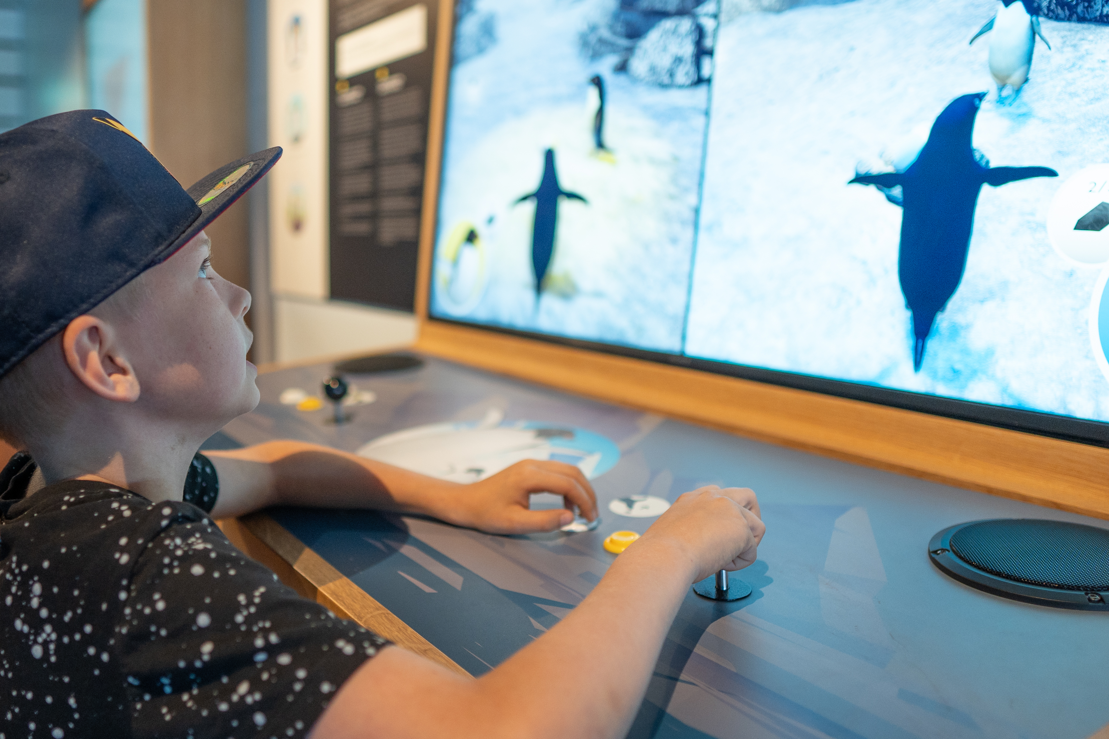 Vi har til pingvinanlægget leveret en række skærme, som er indbygget i udstillingerne. En del af skærmene er touchskærme, så gæsterne kan navigere rundt og læse mere om pingvinerne. Der er ligeledes installeret en række Epson Ultra Short Throw laserprojektorer, der viser små film med information om pingvinerne.
