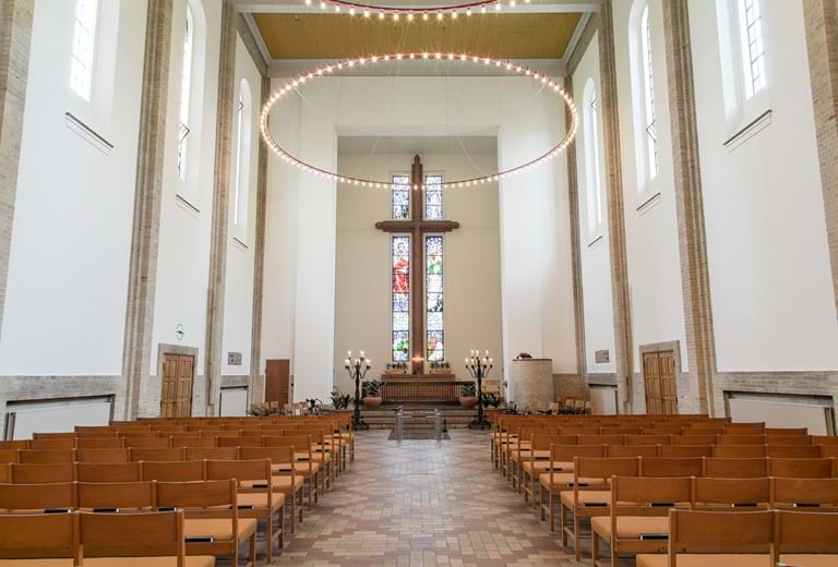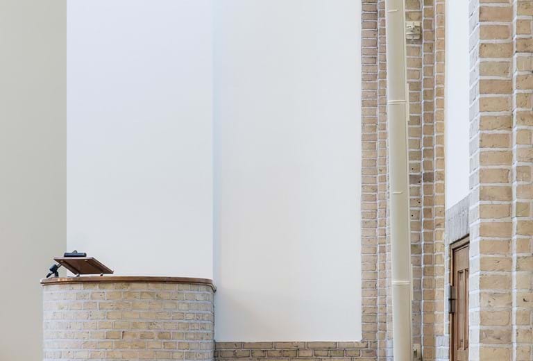 Til Kirkegårdskapellet i Odense har vi leveret en højttalerløsning med 3 x 2 BOSE MA12 højttalere. Da lokalet er meget langt, er der sat 3 højttalere ovenpå hinanden. Denne bestykning gør, at hele lokalet dækkes med lyd. Alle højttalere og beslag er speciallakeret i en farve, der matcher væggenes farve. Dette gør, at højttalerne er meget diskrete, og ikke stjæler fokus i lokalet.
