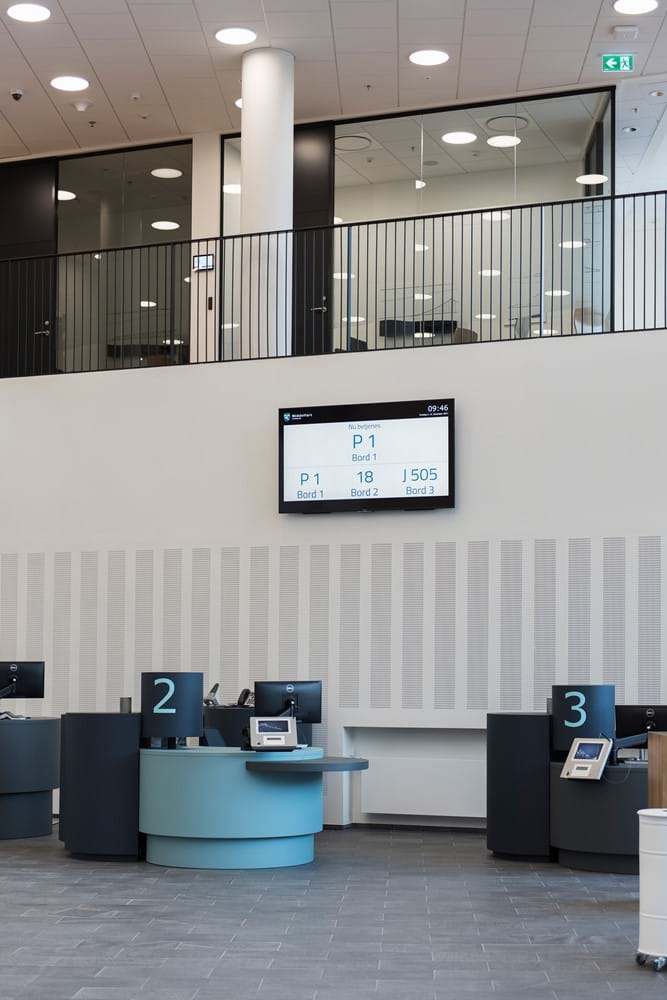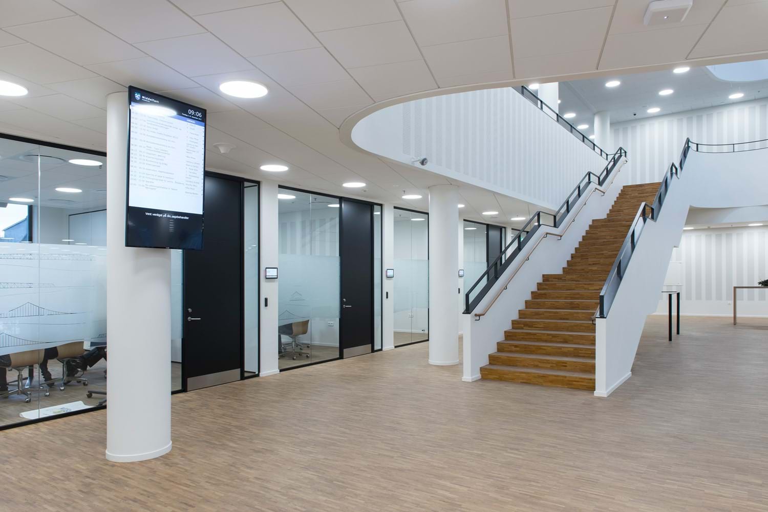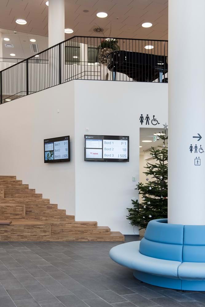 I foyerområdet på førstesalen er der installeret Phillips infoskærme på højkant. Infoskærmene viser oversigt over mødelokalernes brug.
