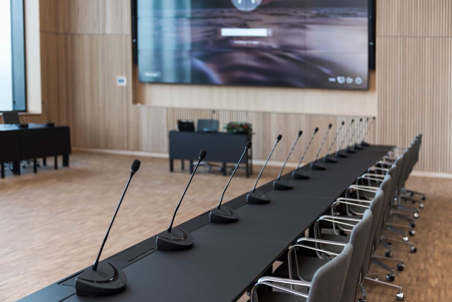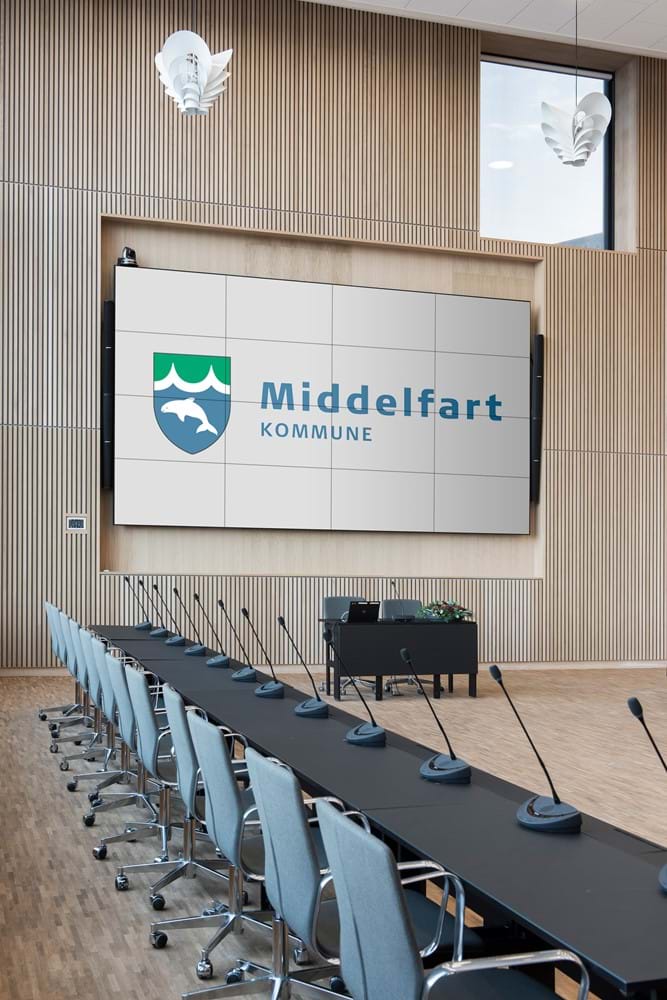 Skærmvægsløsning med 16 skærme i byrådssalen