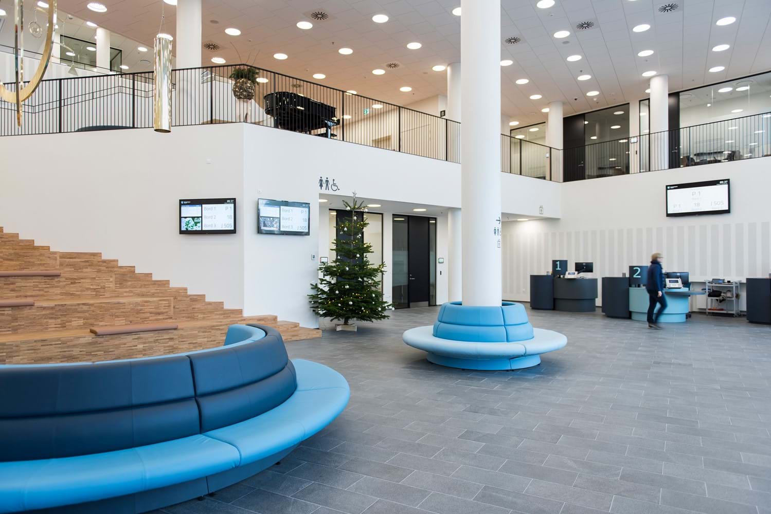 Det første man møder, når man træder ind i det store rådhus er er store og lyse foyer, der indeholder reception og borgerservice. I foyerområdet er der opsat en række Philips infoskærme der viser information om, hvilket nummer man er i køen og ved hvilken skranke man skal betjenes. Da skærmene er placeret i et venteområde vises der også nyhedsspots fra TV2 News.