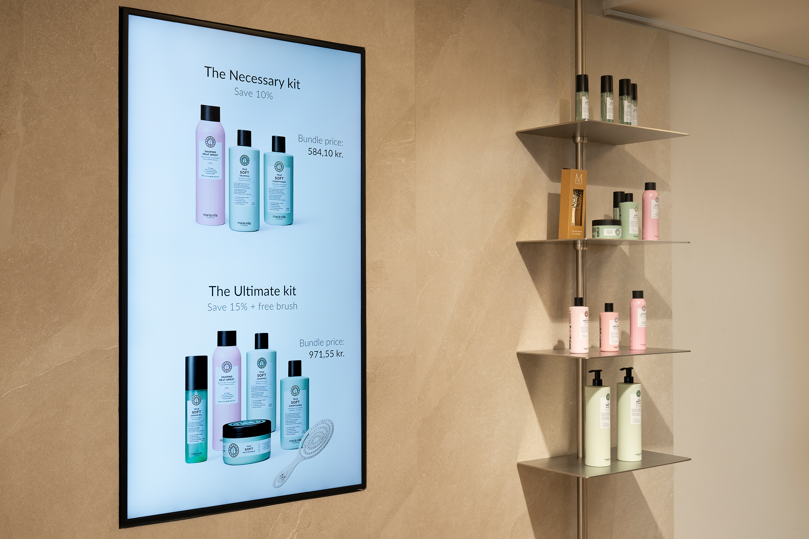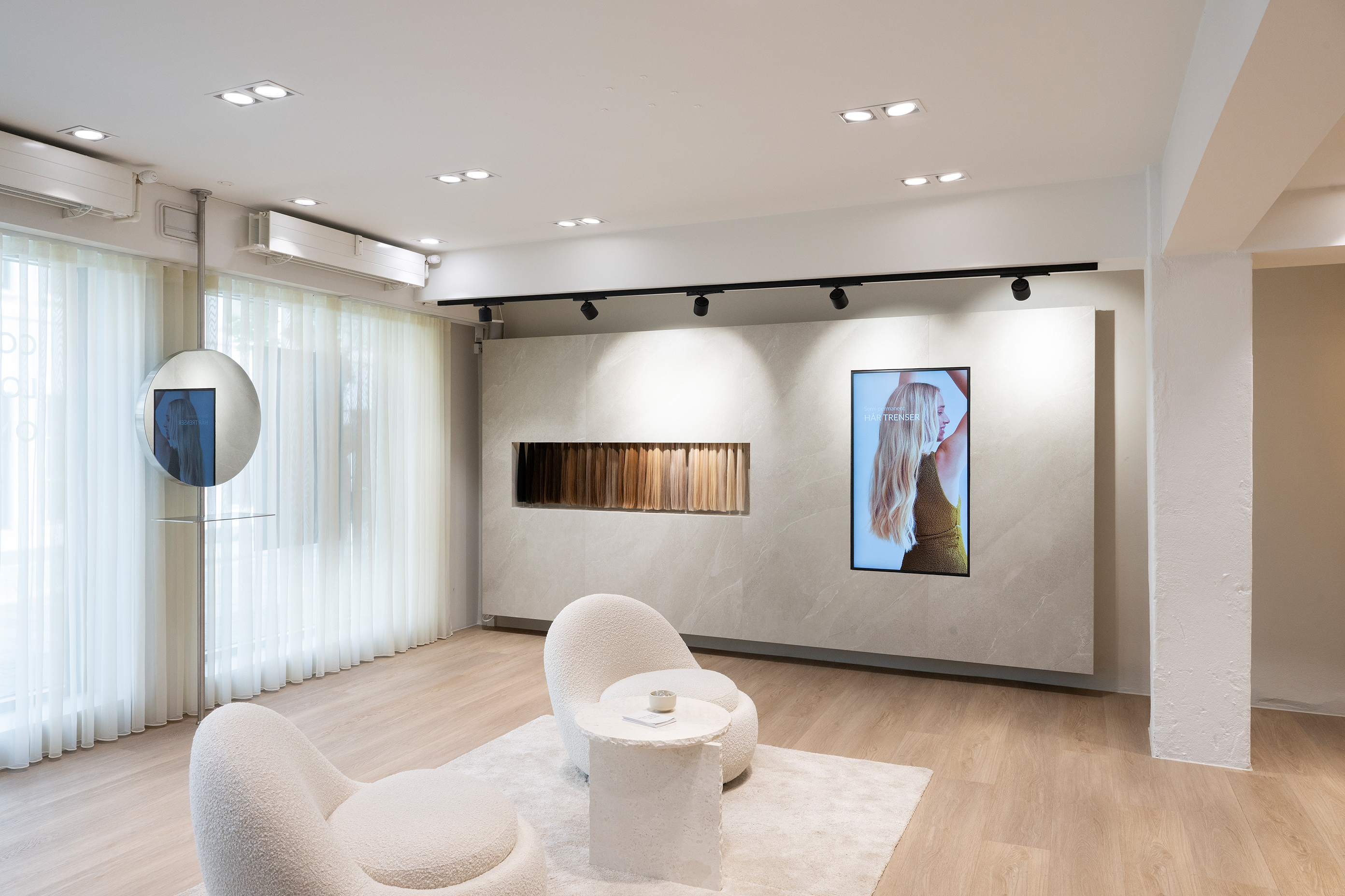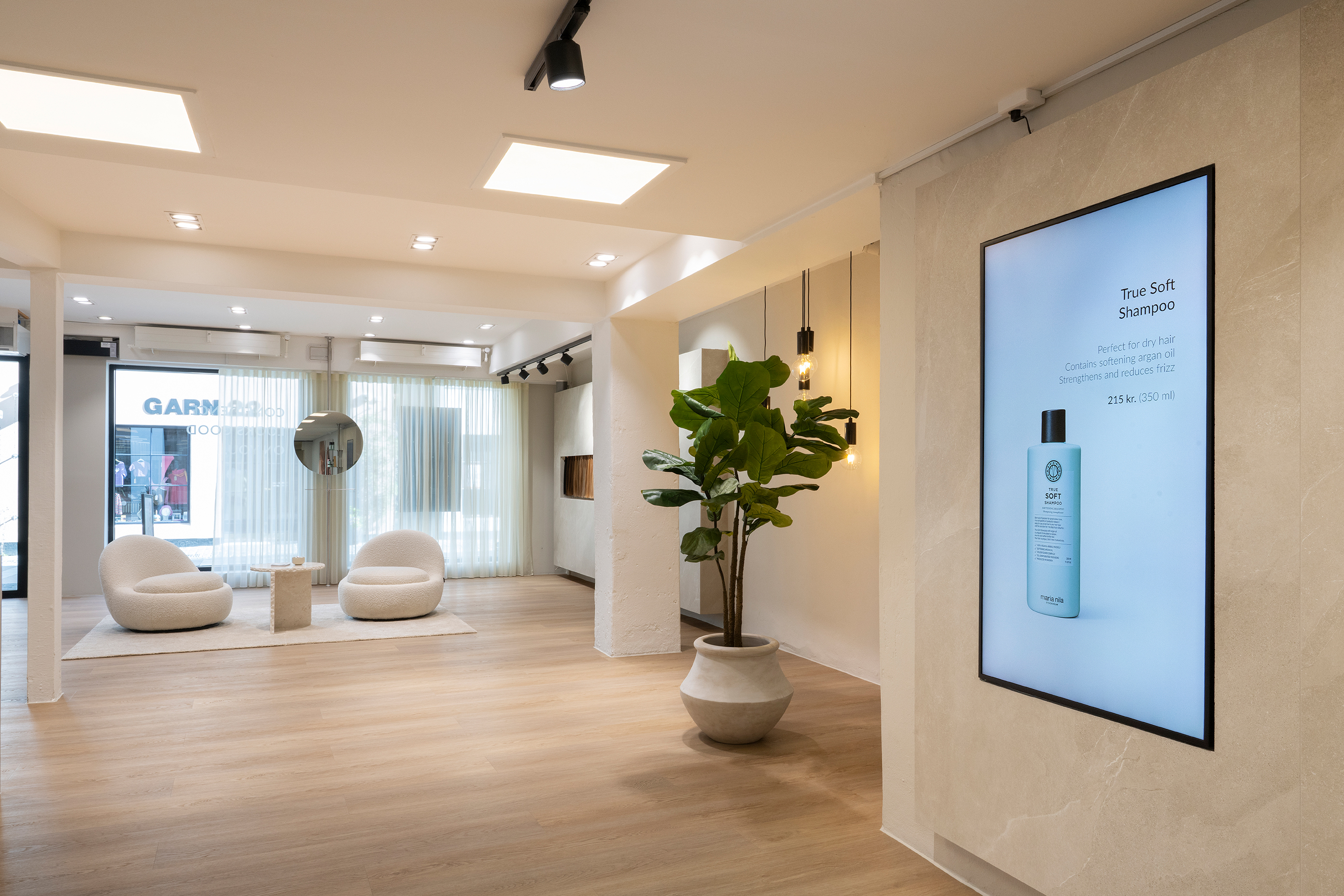 Indvendigt er der valgt skærme med høj haze og antiglare-belægning, som reducerer genskin fra ovenlys og spots. Det giver en stabil og tydelig visning af indholdet i hele butikken. Skærmene er integreret i væggene, så de understøtter lokalets æstetik frem for at dominere den.