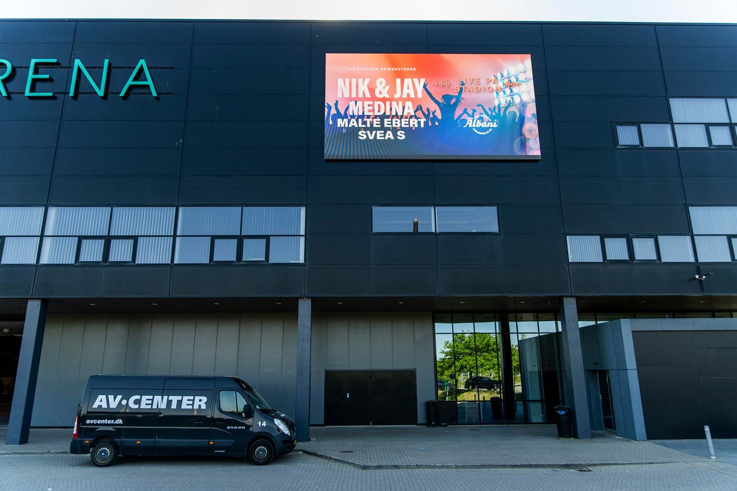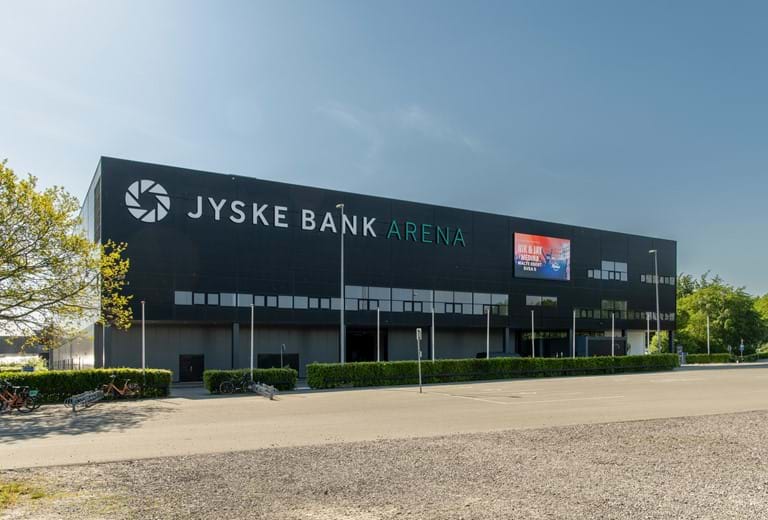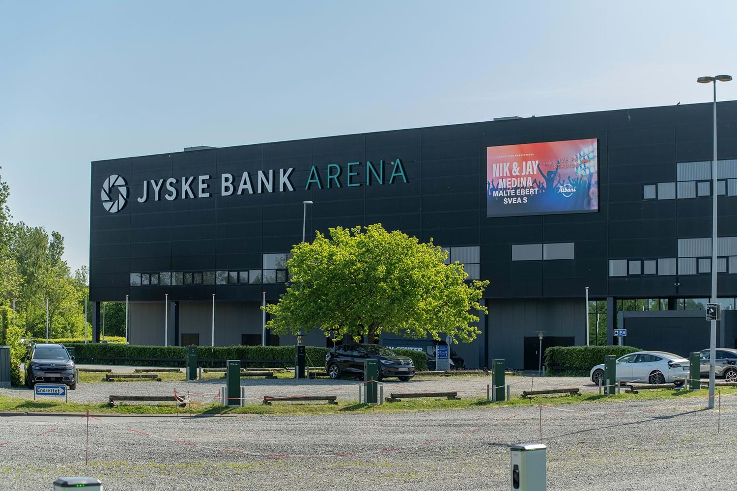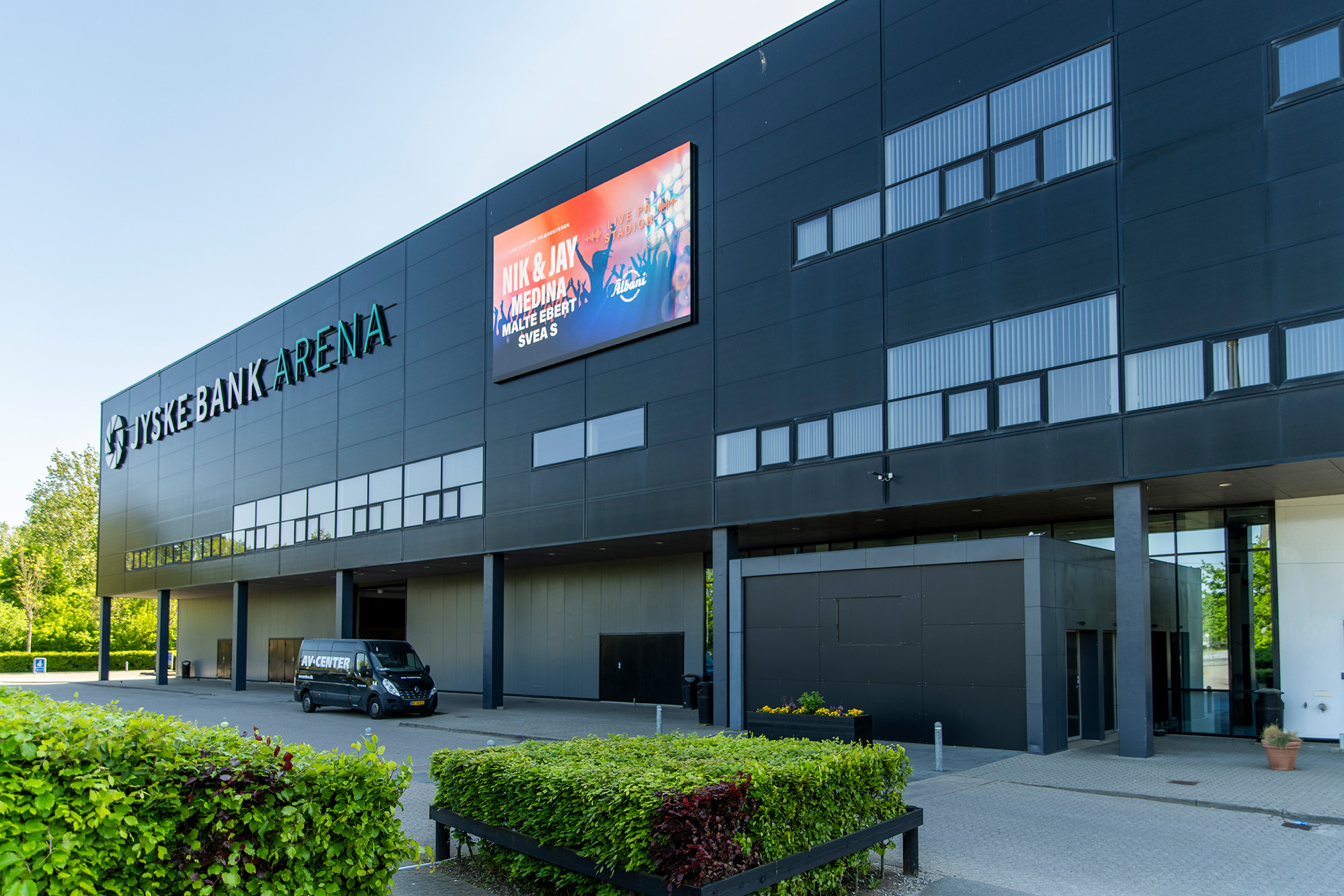 Den anden LED-storskærm måler 9x5 meter og er placeret på Jyske Bank Arena og vender ud mod parkeringsarealerne og den trafikerede Ørbækvej. Denne placering sikrer, at både forbipasserende og besøgende nemt kan se annonceringer og reklamer, hvilket giver en bred eksponering og øger synligheden for de mange arrangementer, der finder sted i arenaen.