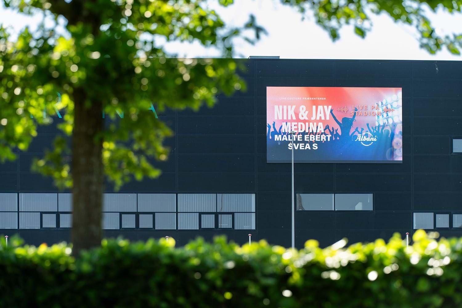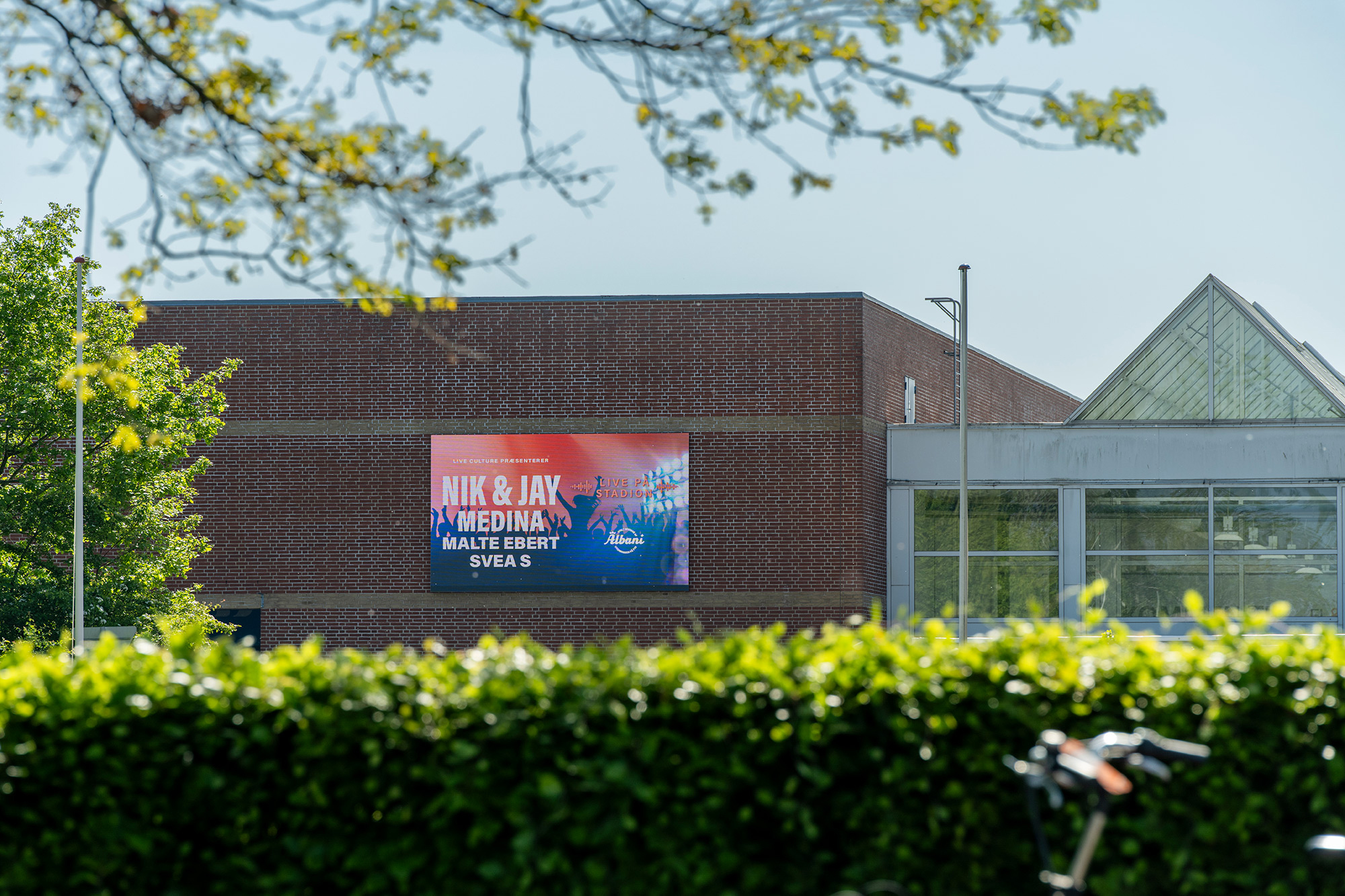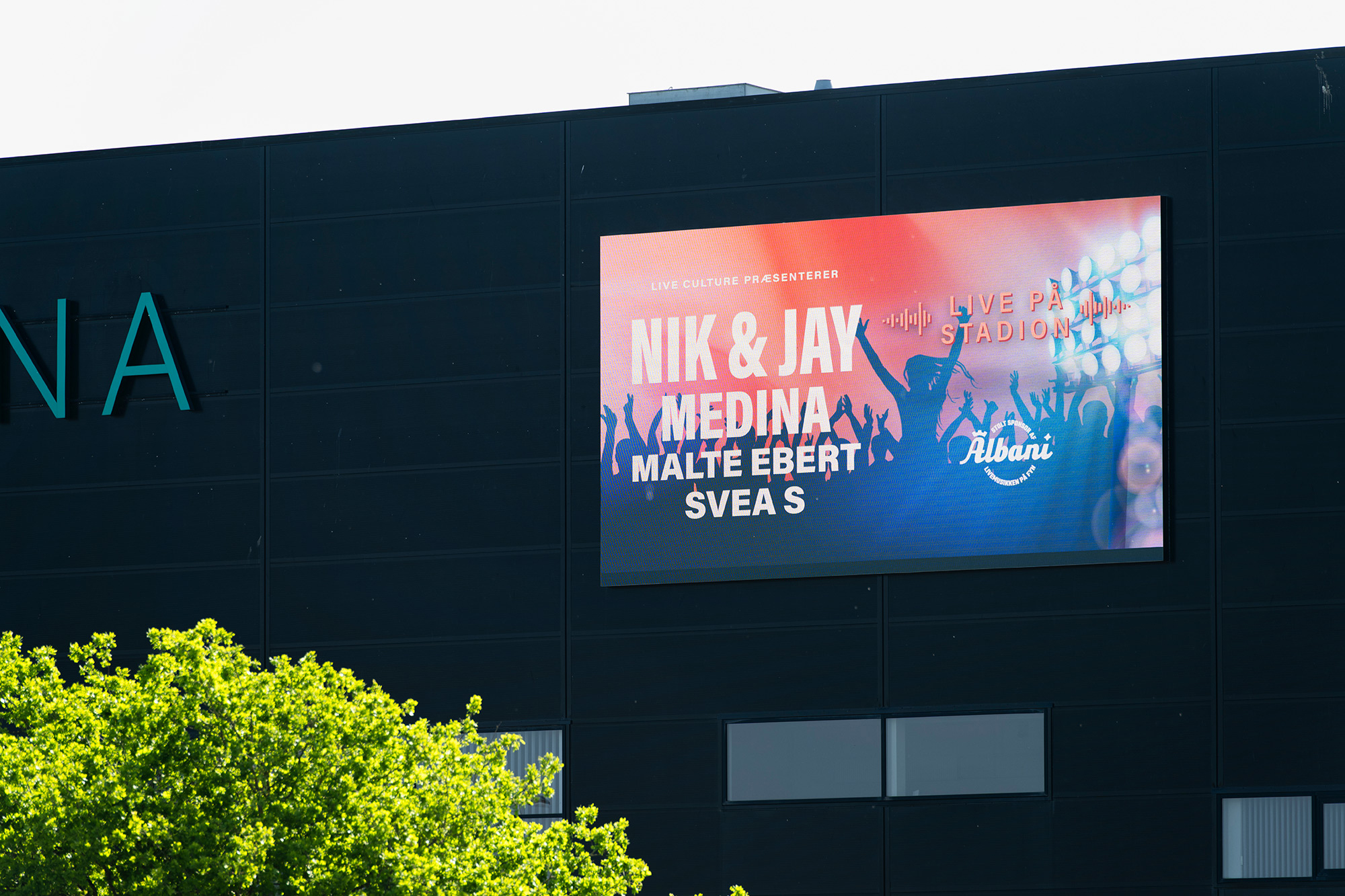 Den anden LED-storskærm måler 9x5 meter og er placeret på Jyske Bank Arena og vender ud mod parkeringsarealerne og den trafikerede Ørbækvej. Denne placering sikrer, at både forbipasserende og besøgende nemt kan se annonceringer og reklamer, hvilket giver en bred eksponering og øger synligheden for de mange arrangementer, der finder sted i arenaen.