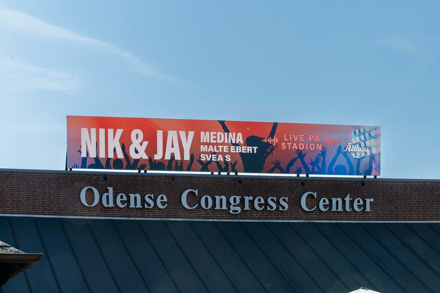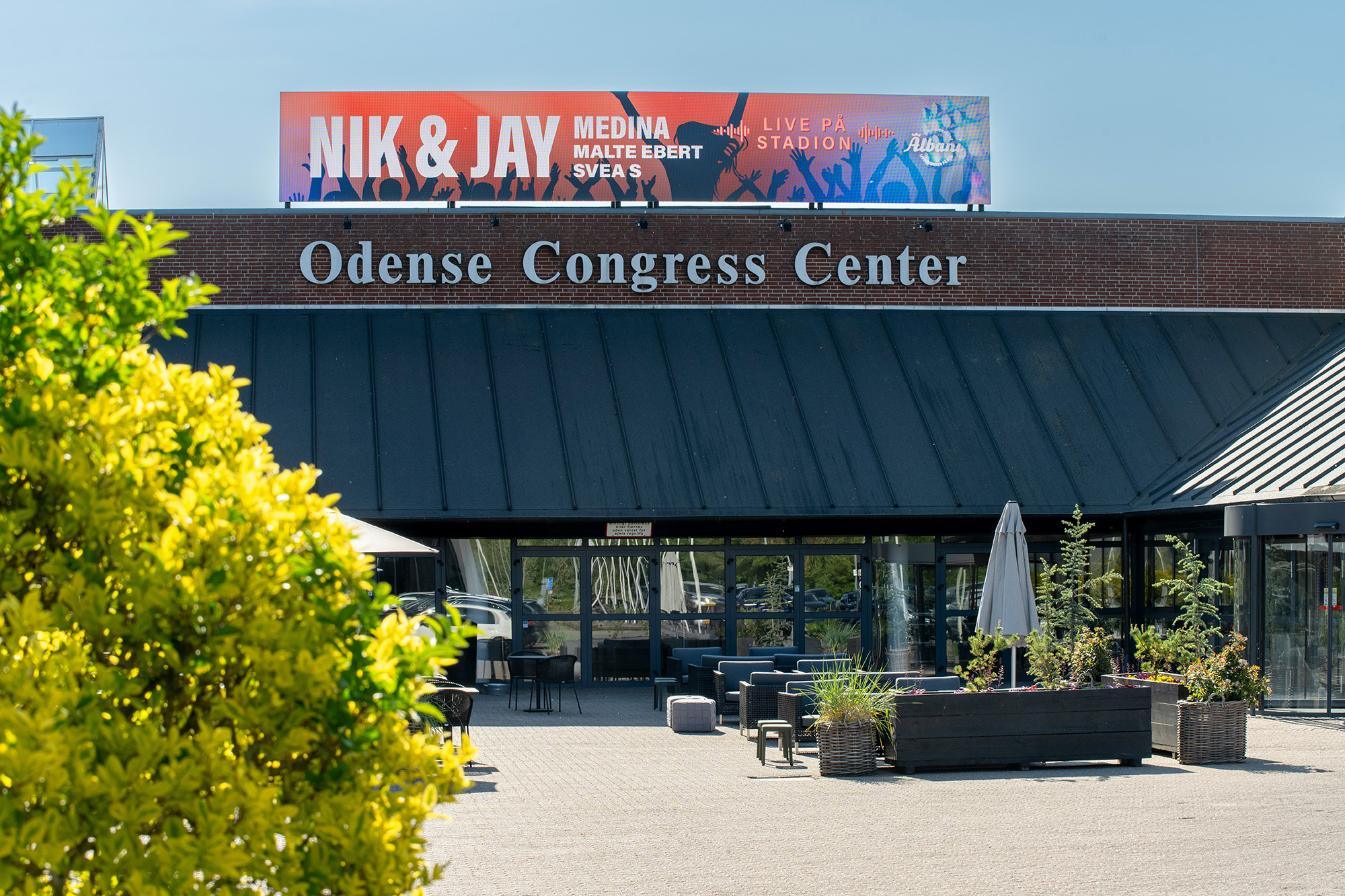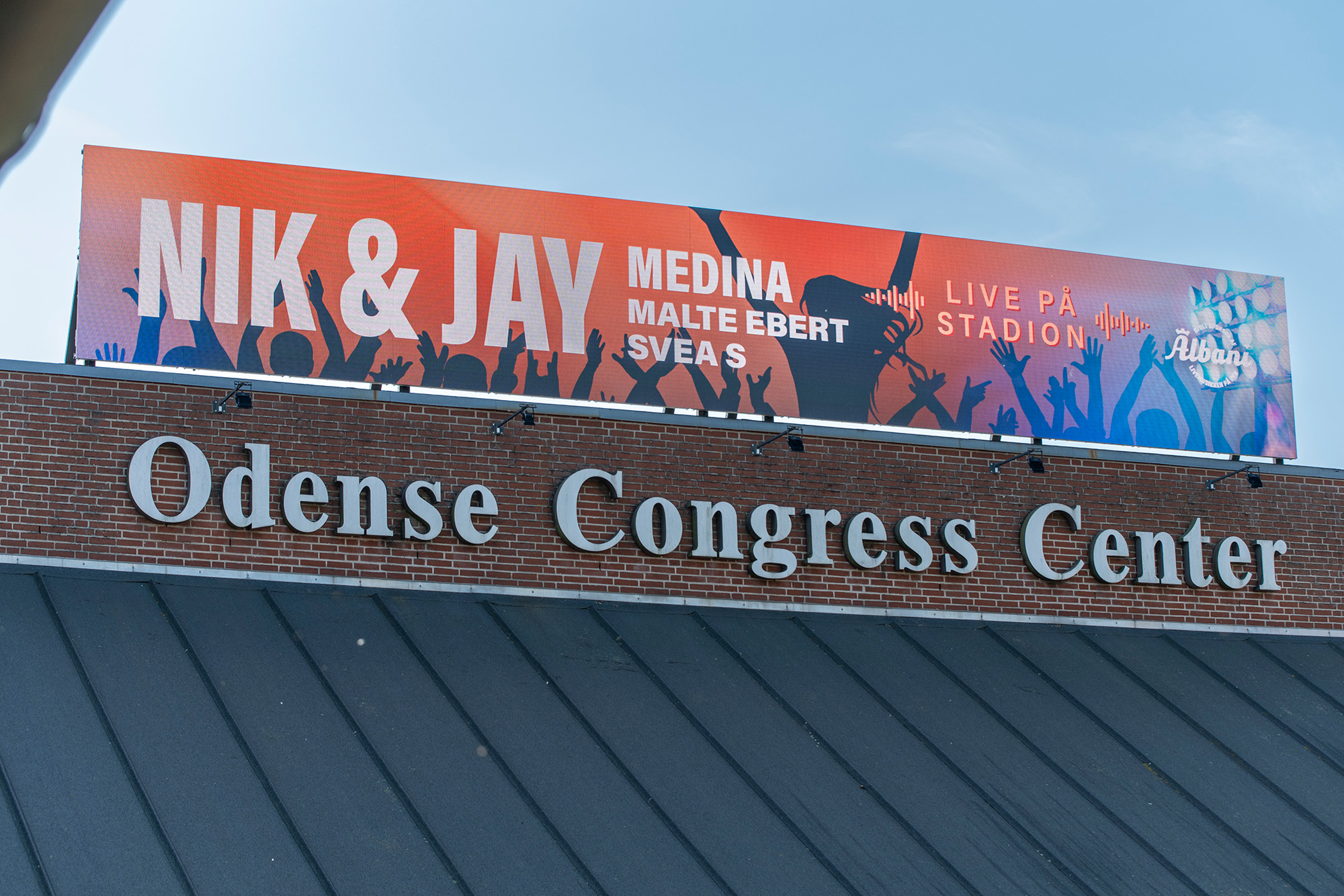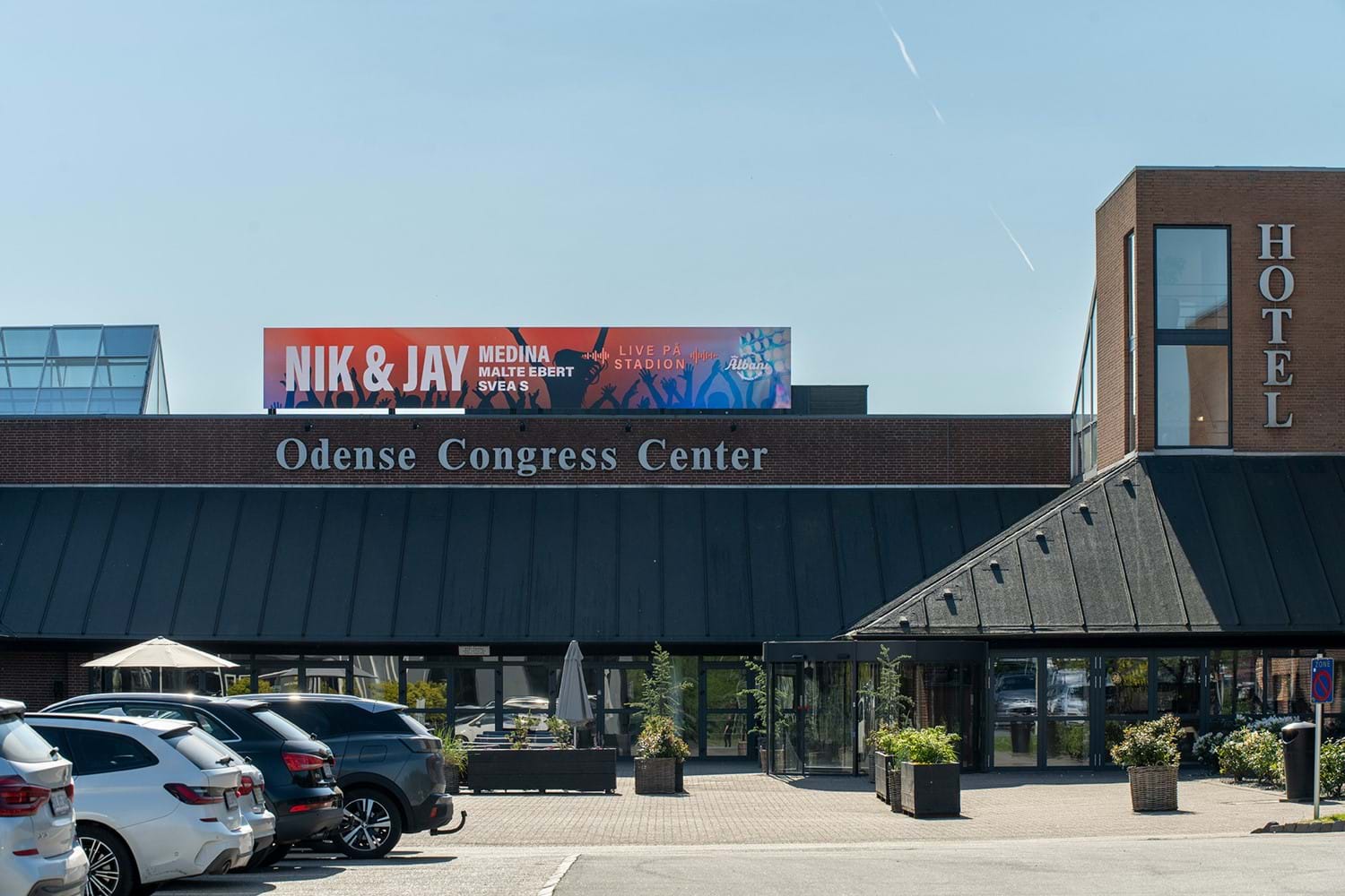 Den første LED-storskærm måler 13x2 meter og er placeret strategisk i hotelgården mellem kongrescenteret og Hotel Odense. Denne skærm giver besøgende og gæster mulighed for at få vigtige oplysninger og opdateringer på tværs af de to faciliteter.