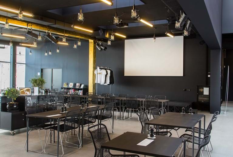 Ved event- og caféscenen er der ligeledes placeret Crestron touchpaneler. Her kan man via presets tænde lys, køre et lærred ned/starte projektor og tænde for de trådløse mikrofoner.