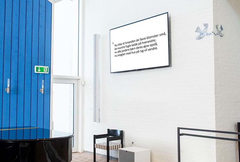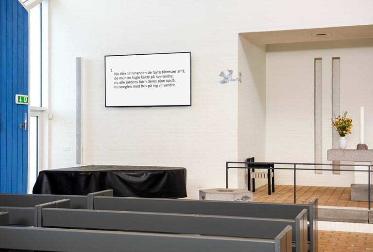 Der er også installeret 2 stk. 85” professionelle Sony skærme, der bruges til visning af blandt andet salmenumre under gudstjenester og når kirken bruges til andre arrangementer, bruges skærmene til at vise præsentationer. Der er ydermere installeret medkigsskærm ved orglet, Crestron betjeningssystem med touchskærm for intuitiv betjening, Sennheiser mikrofonsystem og antennedistribution.