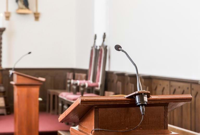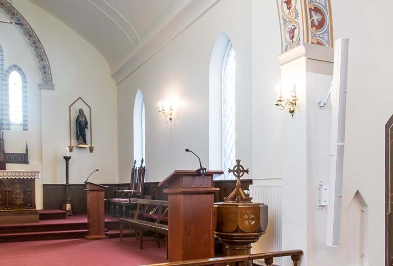 Til den katolske Sankt Nikolaj Kirke i Aarhus har vi leveret en løsning med to Bose MA12 højttalere og tilhørende mikrofonanlæg, hvor svanehalsmikrofonerne er placeret på de pulte, hvorfra der prædikes, og på alteret. En smart og brugervenlig detalje er, at hver enkel mikrofon kan tændes og slukkes på en knap, der diskret er placeret inde i pulten.