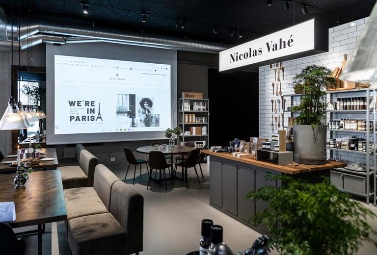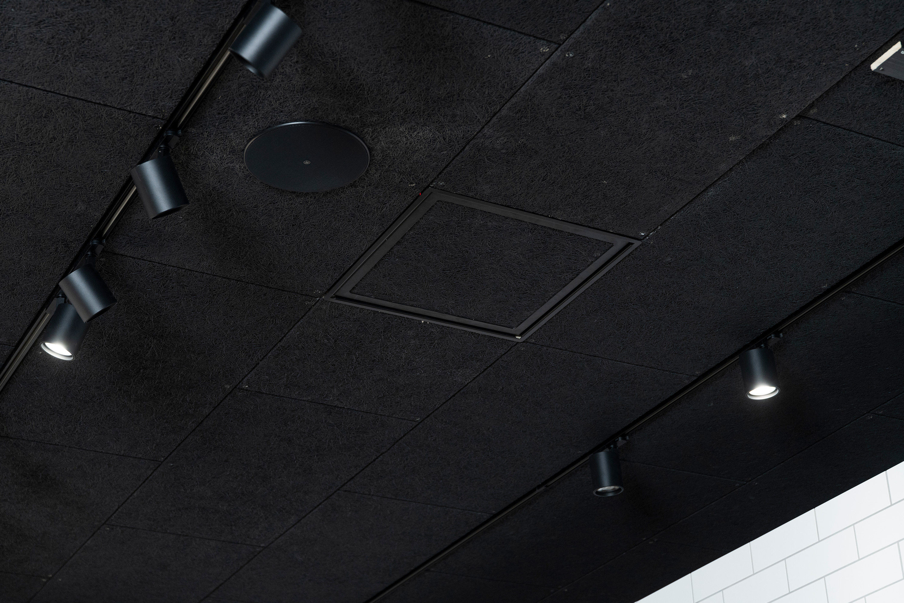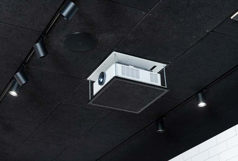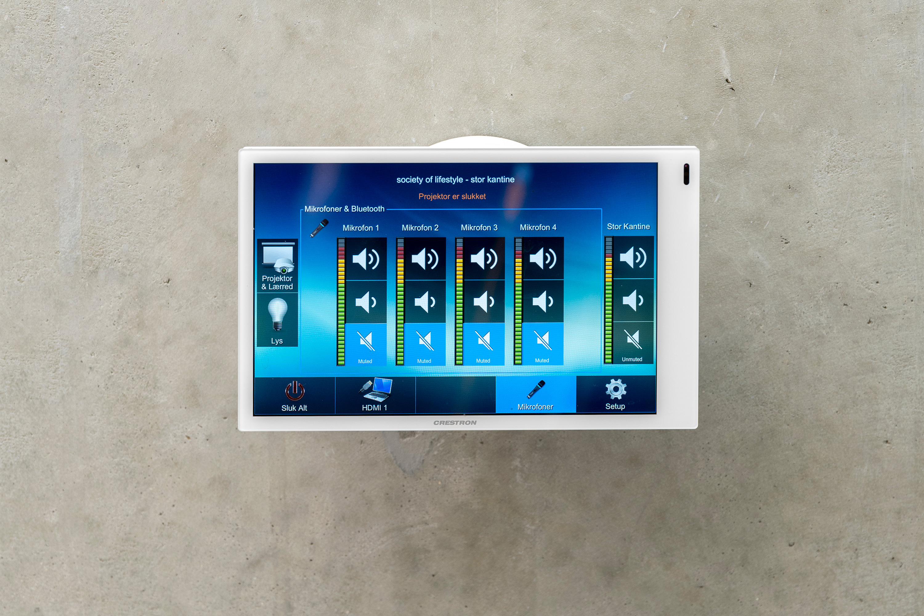 Alle installationer er udført, så både projektor og motorlærredet er integreret og skjult i loftet, når det ikke er i brug. De kraftige laserprojektorer er monteret i lifte, der kører ned sammen med motorlærredet, når der trykkes på betjeningspanelet. I kantinen betjenes udstyret via et Crestron betjeningspanel og i showroomet styres det via et 8-knapsbetjeningspanel fra Biamp (tidl. Neets).