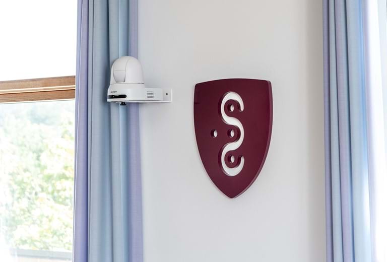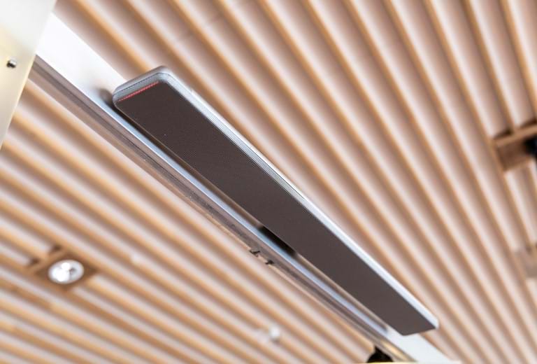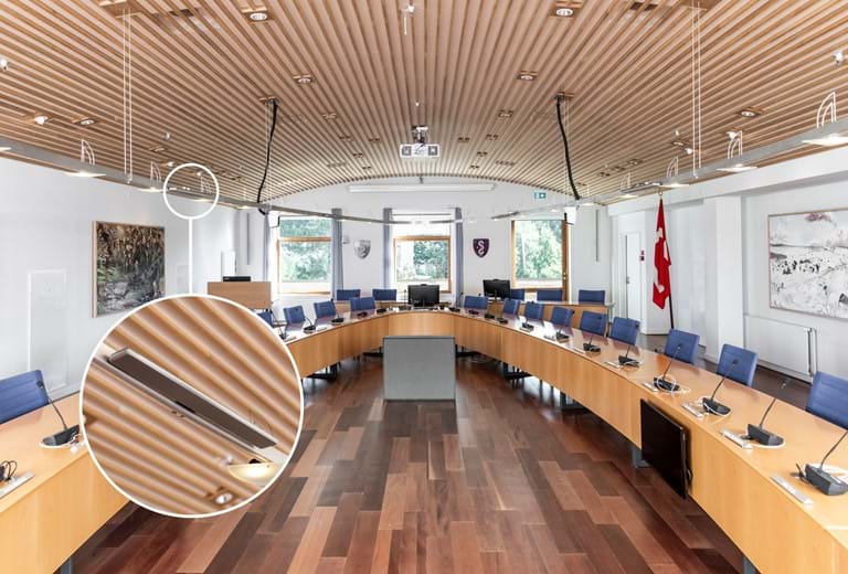 Byrådssalen i Ebeltoft benyttes naturligvis til byrådsmøder, men for at optimere brugen af lokalet, har vi leveret en løsning, der giver mulighed for at afholde online Teams-videomøder. I byrådssalens imponerende lys-halo installation har vi monteret 6 aflange Shure loftsmikrofoner. Som i konferencelokalet, har vi installeret Yamaha søjlehøjttalere og betjening fra Crestron. Teams-videomøderne styres ligeledes fra et Poly betjeningspanel
