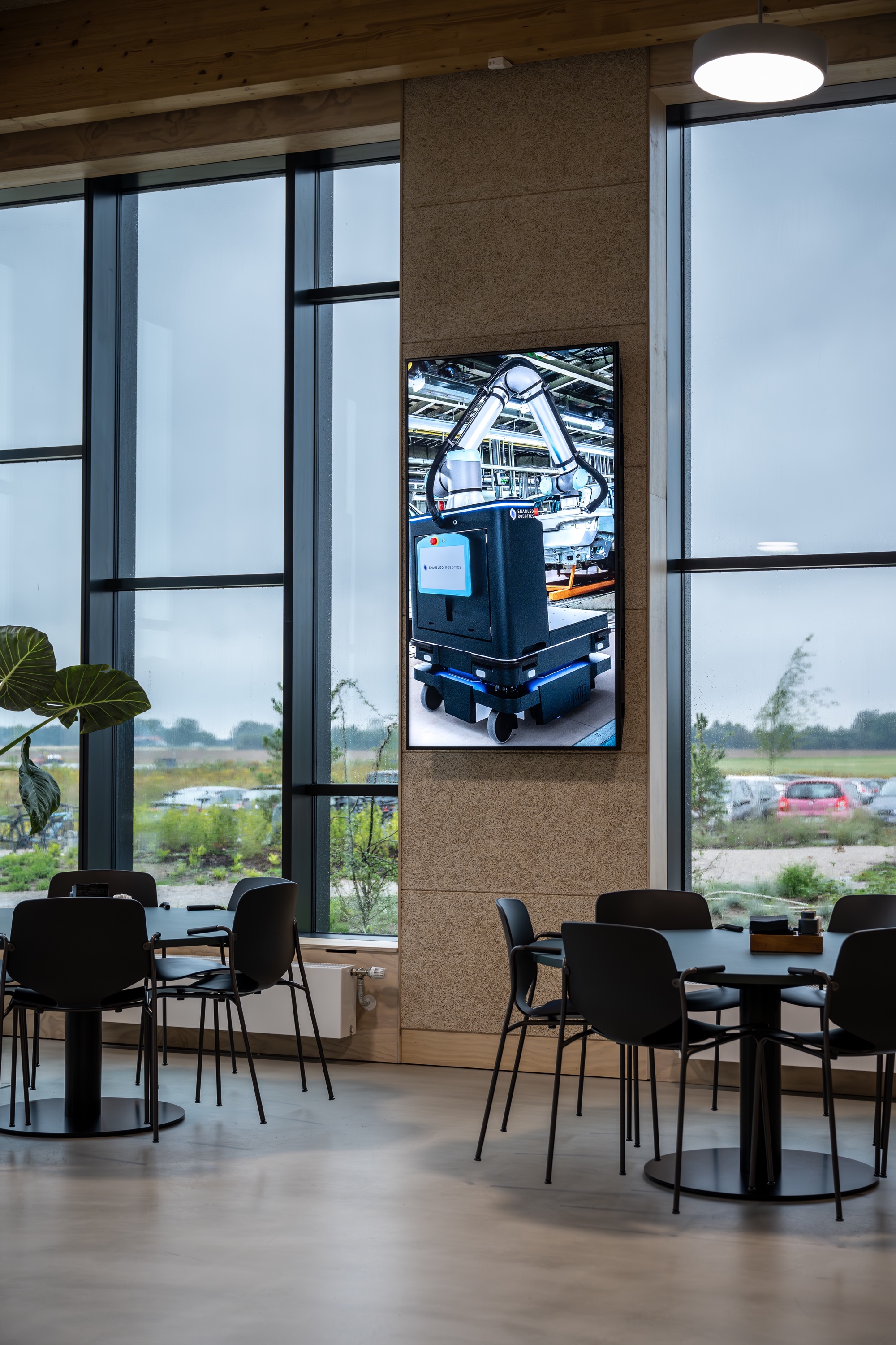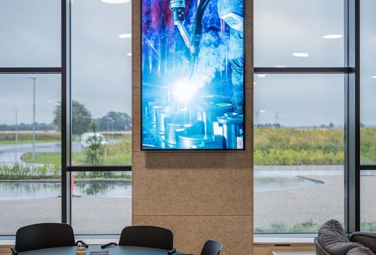 En central del af AV-løsningen er et avanceret skærm-setup i medarbejderkantinen, hvor vi har installeret en række 75” SONY-skærme, der kan roteres mellem landscape og portrait mode afhængigt af behovet. Dette fleksible setup giver mulighed for at tilpasse visningen til forskellige præsentationer og arrangementer, hvilket gør det muligt at skabe den helt rigtige visuelle oplevelse for både medarbejdere og gæster.