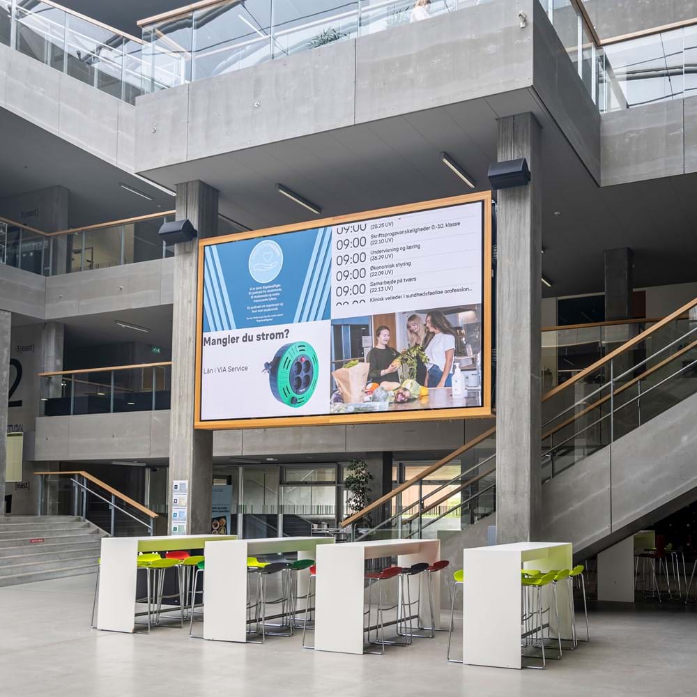 Centralt i Campus N findes Fællestorvet. Her har vi har leveret en 4,8 meter bred og 2,7 meter høj Samsung LED-storskærm. Samsung LED-storskærmen er flot indbygget i et trækabinet, og har erstattet en traditionel 4 x 4 skærmvæg med 55” skærme.