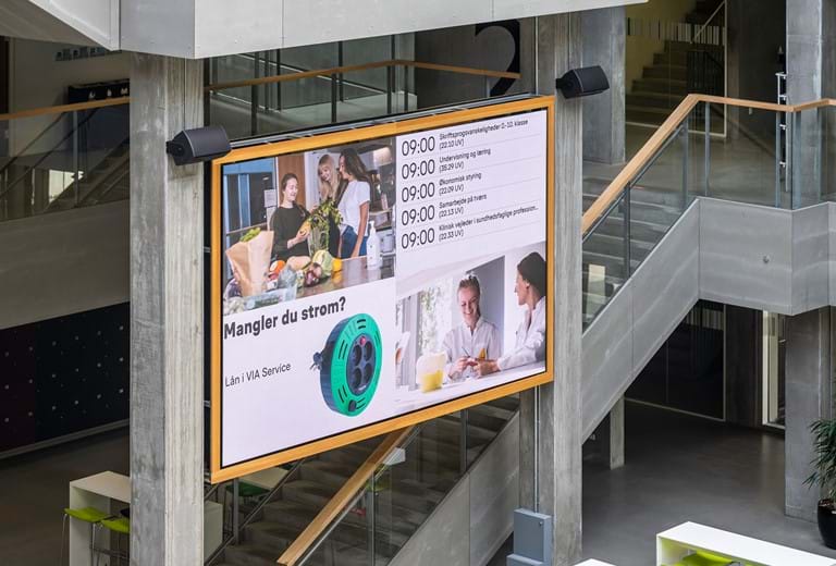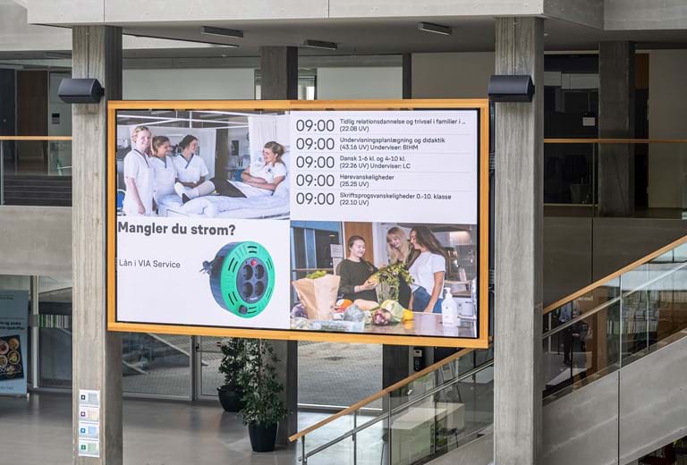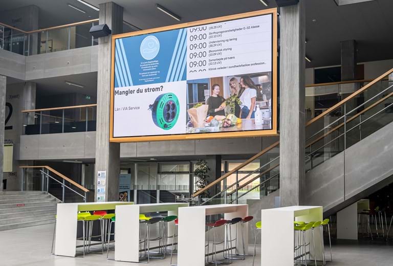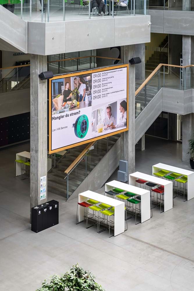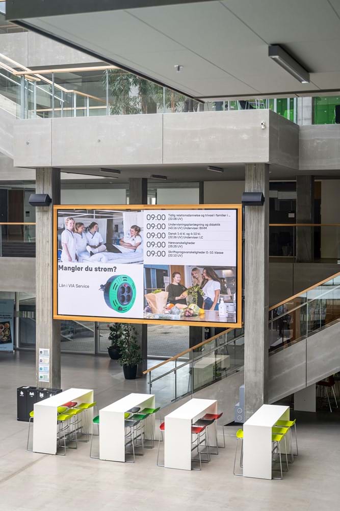 Til dagligt anvendes den 217” store Samsung LED-storskærm som infoskærm, og viser praktisk information til de studerende.