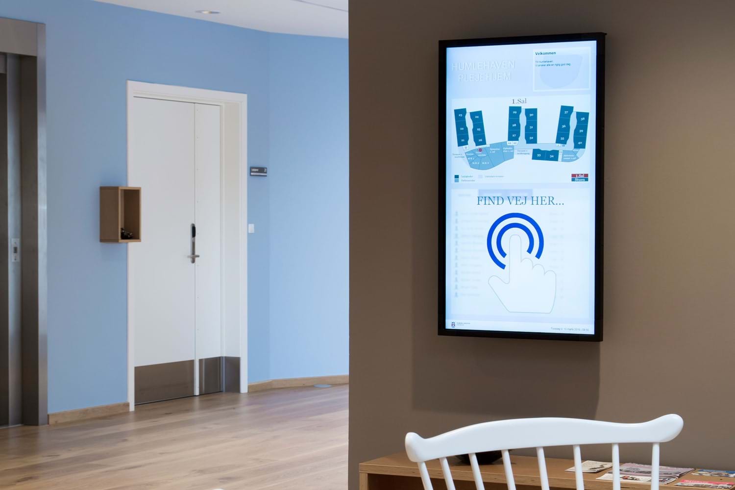På plejehjem eller uddannelsesinstitutioner, hvor der ikke nødvendigvis er en reception, kan en opdateret infoskærm fortælle pårørende og gæster den nemmeste vej hen til beboeren eller kontoret.