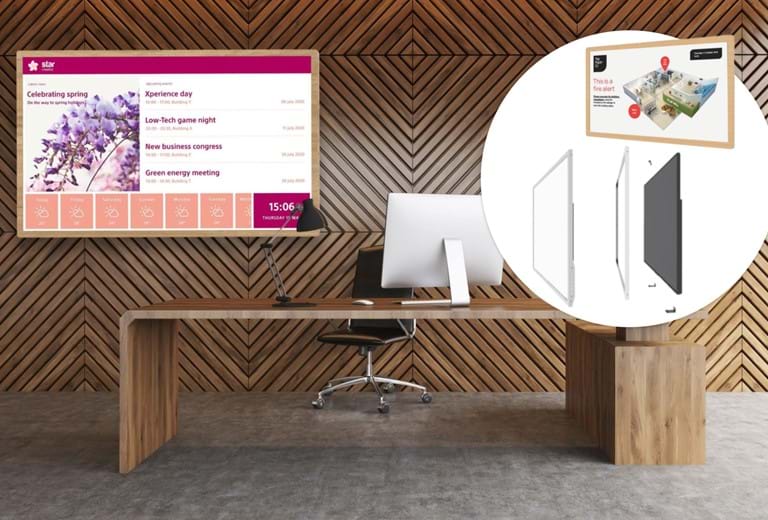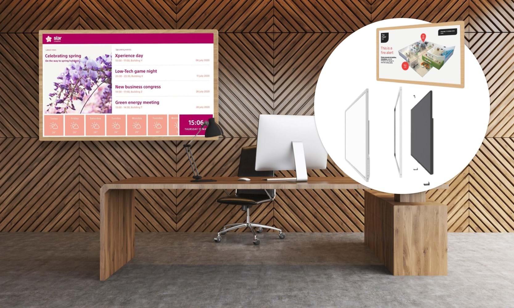 Det betyder dog ikke, at dine skærme ikke kan tilpasses de omgivelser de skal placeres i. Skærmen kan eksempelvis indbygges i en stander, eller udstyres med en træramme i en til omgivelserne matchende farve.