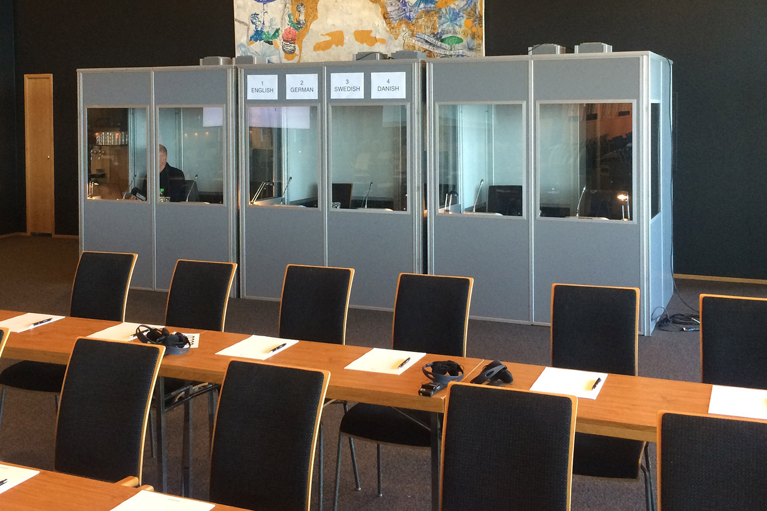 - Hvordan er lokalet indrettet og hvordan er tolkene placeret ift. dette?