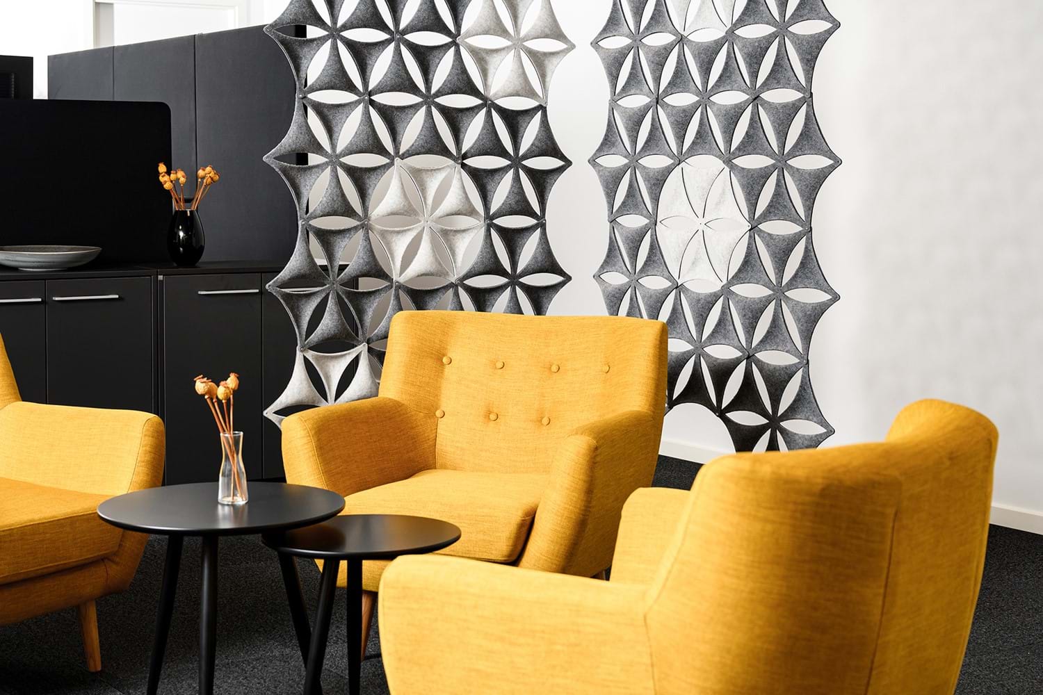 Ved løsninger som ovenstående benytter vi typisk leverandører som Abstracta og Lintex, der begge er svenske virksomheder, som har specialiseret sig i at lave akustikløsninger af en høj kvalitet. Begge virksomheder har som nævnt et hav af muligheder hvad angår både farver og former, og kan både indgå som et subtilt element i mødelokalet, men også stå frem med en fremtrædende farve og mere blive et designelement.