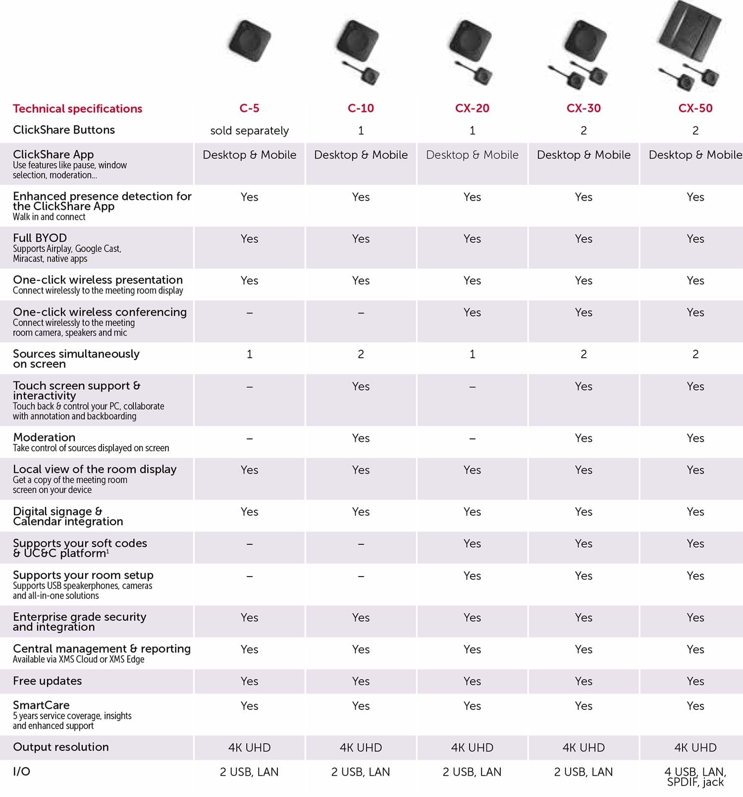 De to nye produkter er henholdsvis ClickShare C-5 og ClickShare C-10. De to produkter har en række lighedspunkter, men også nogle ting der adskiller dem fra hinanden.