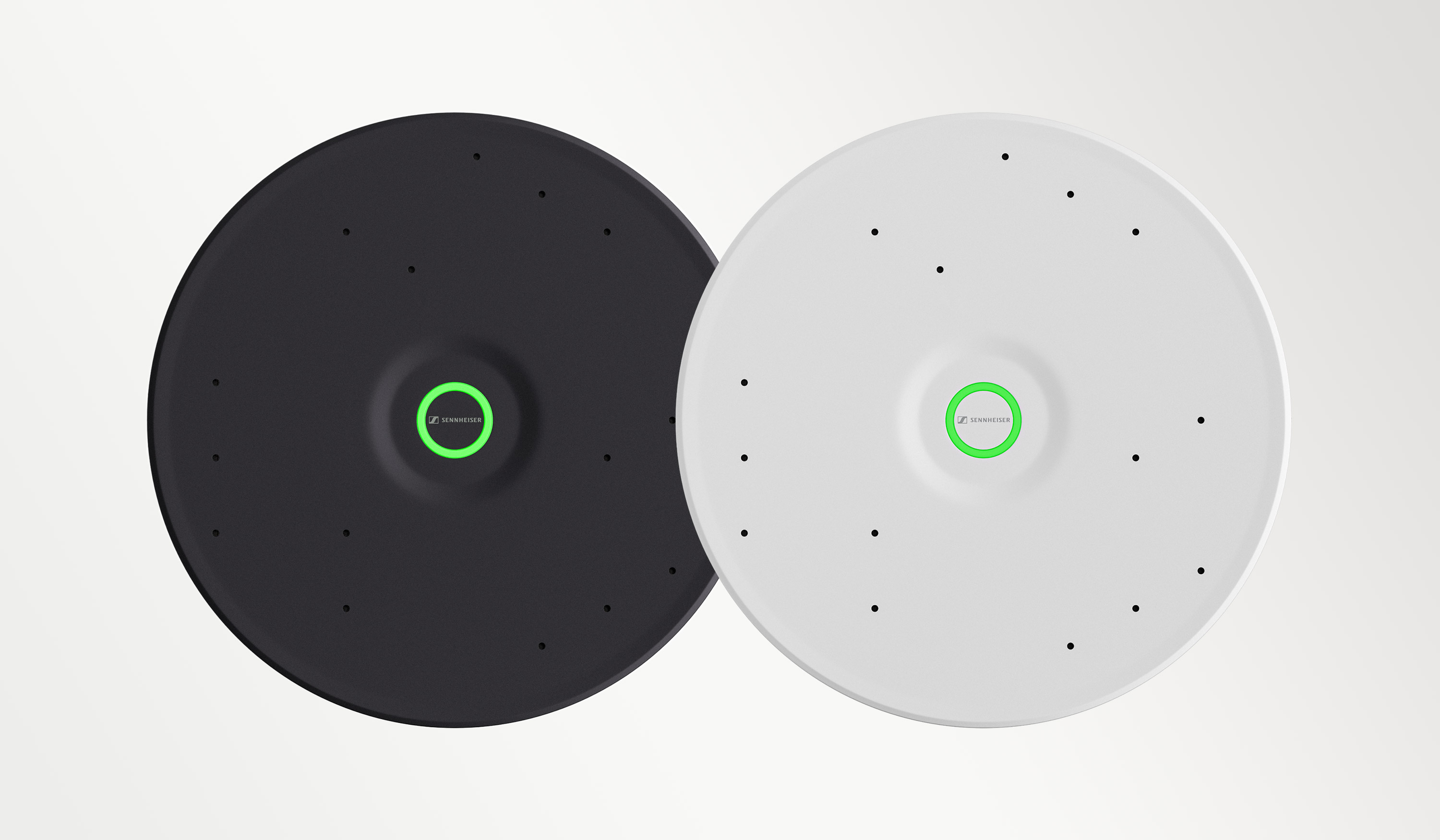 TeamConnect Ceiling Medium er mulig at brande på forskellige måder. Du kan eksempelvis udskifte Sennheiser-logoet i bunden af den runde loftsmikrofon med din egen virksomheds logo.