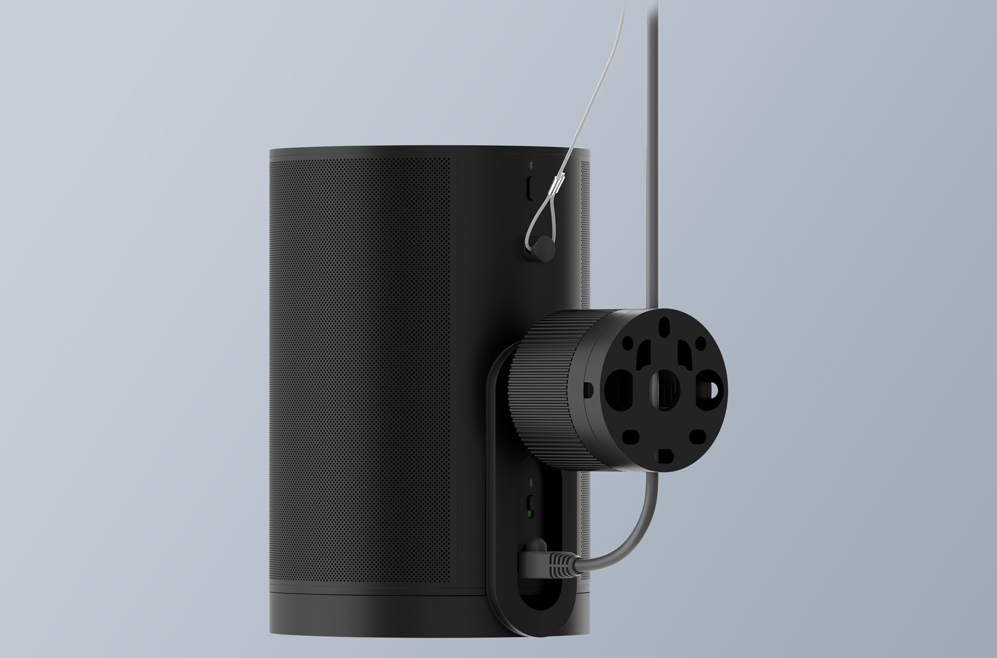 Vi anbefaler, at SONOS Era 100 Pro monteres på SONOS' eget ophængsbeslag. Beslaget har et justerbart design, hvor beslagets kugleled gør det muligt at ændre højttalerens position og derefter fastlåse den. Du kan også skjule kablet i beslaget for et stilrent look og som ekstra sikkerhed, kan der også påsættes en sikkerhedswire.