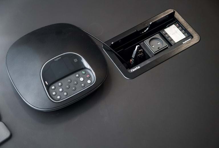 kantinen er der installeret Crestron betjeningspaneler for nem og intuitiv betjening af AV udstyret. I andre møde-lokaler er der i mødebordene integreret Neets EasyConnect bordbrønd med tilslutningskabler, strøm og Neets betjeningspanel for nem og hurtig betjening af AV udstyret.