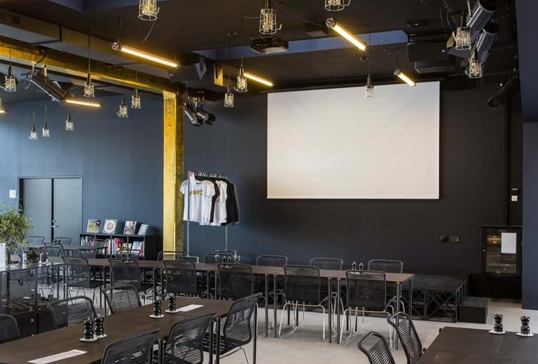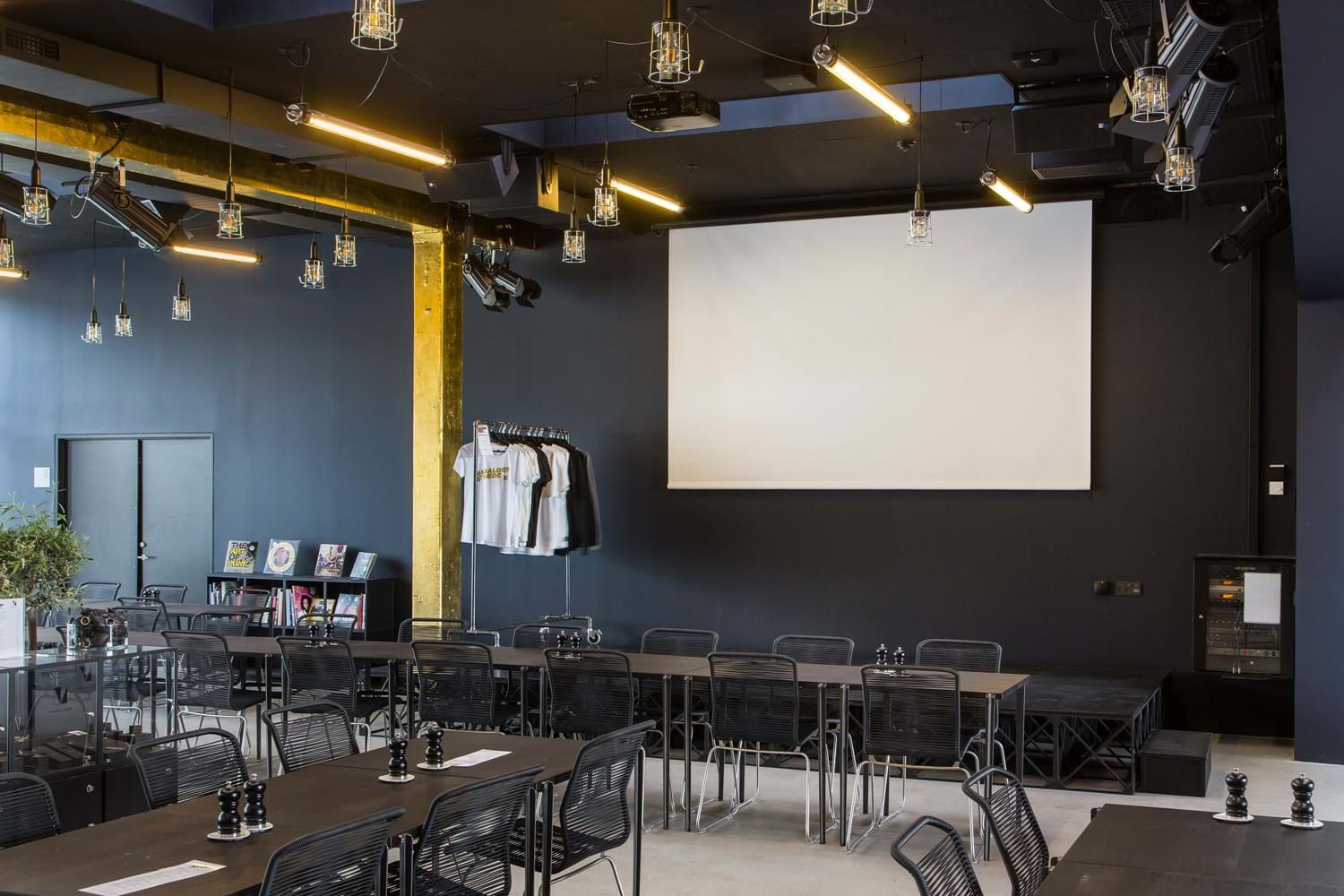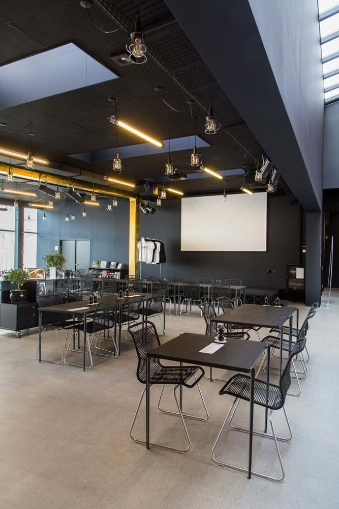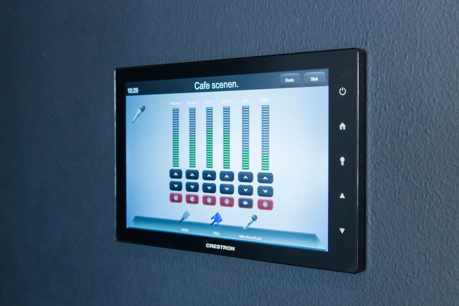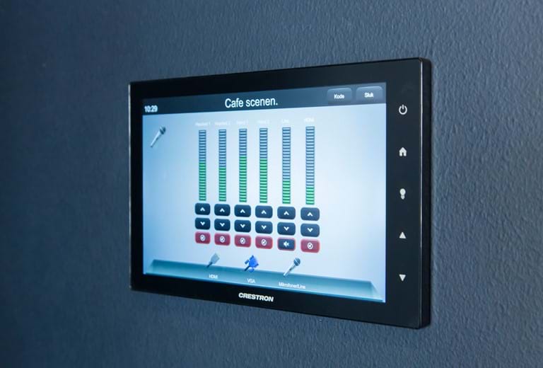Ved event- og caféscenen er der ligeledes placeret Crestron touchpaneler. Her kan man via presets tænde lys, køre et lærred ned/starte projektor og tænde for de trådløse mikrofoner.
