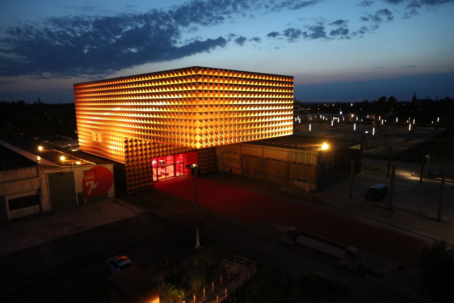Bygningen fremstår ikke kun ikonisk i dagslys, for når det bliver mørkt belyses hele bygningen. Denne belysning skaber refleksioner og skyggeeffekter i bygningens beklædning, som er helt unikke. Den røde betonløber kan ved events mv. belyses med 8 stk. SGM bevægelamper.