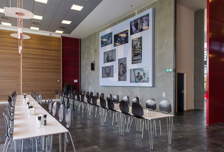 I mødelokalerne med Crestron Mercury og i kantinen er der installeret Barco Clickshare for nem og trådløs overførsel mellem mødedeltagernes PC’er og lokalernes skærme.